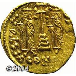 <B>Constantine IV.</B></I> A.D. 668-685. AV solidus (19 mm, 4.39 g). Constantinople, A.D. 674-681. Helmeted and cuirassed bust facing slightly right, holding spear and shield decorated with horseman spearing a fallen enemy / Cross potent on three steps between standing figures of Heraclius and Tiberius; ?/CONOB. Cf. DOC 10; SB 1156. XF. <BR><I>From the Geneva Collection.</B></I> <BR><BR><B>Important notice:</B> Heritage usually auctions material at the rate of 200-250 lots per hour. On some occasions eBay Live bid software or the Internet may not be able to keep up with the pace of the auction. We recommend placing a realistic absentee bid now as insurance to avoid disappointment. Occasionally the auctioneer may eliminate or reject an eBay Live bid, and the auctioneer may also reopen a lot after the close of the eBay live bidding (usually because we missed an audience bid), and may reject your bid even if it shows you as the winning bidder. By bidding via eBay Live, you agree that Heritage may award the lot to another bidder at its sole discretion under the circumstances described above or any other reasonable circumstances. Since eBay bids are not shown to us until we open the lot on the floor, we treat those bids just like floor bids. In most cases the floor responds before the eBay bid is presented to us, due to Internet lag time, so for consistency we have made it a policy that floor bids are always considered first over tie eBay live bids. Also please note that all Heritage lots purchased through eBay Live carry a 20% Buyer's Premium. Please make sure you read the Terms and Conditions before you bid.