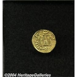 <B>Constantine IV.</B></I> A.D. 668-685. AV solidus (19 mm, 4.39 g). Constantinople, A.D. 674-681. Helmeted and cuirassed bust facing slightly right, holding spear and shield decorated with horseman spearing a fallen enemy / Cross potent on three steps between standing figures of Heraclius and Tiberius; ?/CONOB. Cf. DOC 10; SB 1156. XF. <BR><I>From the Geneva Collection.</B></I> <BR><BR><B>Important notice:</B> Heritage usually auctions material at the rate of 200-250 lots per hour. On some occasions eBay Live bid software or the Internet may not be able to keep up with the pace of the auction. We recommend placing a realistic absentee bid now as insurance to avoid disappointment. Occasionally the auctioneer may eliminate or reject an eBay Live bid, and the auctioneer may also reopen a lot after the close of the eBay live bidding (usually because we missed an audience bid), and may reject your bid even if it shows you as the winning bidder. By bidding via eBay Live, you agree that Heritage may award the lot to another bidder at its sole discretion under the circumstances described above or any other reasonable circumstances. Since eBay bids are not shown to us until we open the lot on the floor, we treat those bids just like floor bids. In most cases the floor responds before the eBay bid is presented to us, due to Internet lag time, so for consistency we have made it a policy that floor bids are always considered first over tie eBay live bids. Also please note that all Heritage lots purchased through eBay Live carry a 20% Buyer's Premium. Please make sure you read the Terms and Conditions before you bid.