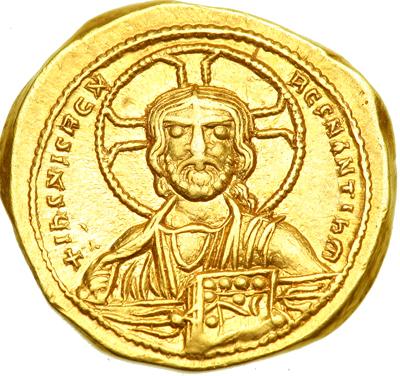 Constantine IX, Monomachus, 1042-1055. Gold Tetarteron Nomisma (4.0 g). Bust of Christ facing, wearing nimbus cr., pallium and colobium. Reverse: Bust facing of the emperor, bearded, wearing crown and jeweled chlamys, and holding scepter and globe. Sear 1832. Well struck, perfectly centered with full legends on both sides. Extremely Fine.