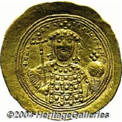 <B>Constantine IX.</B></I> 1042-1055. AV histamenon nomisma (27 mm, 4.44 g). Constantinople. Bust of Christ facing, raising right hand in benediction and holding Gospels / Bust of Constantine facing, holding long cross and globus cruciger. DOC 3; SB 1830. Good XF. <BR><I>From the Geneva Collection.</B></I> <BR><BR><B>Important notice:</B> Heritage usually auctions material at the rate of 200-250 lots per hour. On some occasions eBay Live bid software or the Internet may not be able to keep up with the pace of the auction. We recommend placing a realistic absentee bid now as insurance to avoid disappointment. Occasionally the auctioneer may eliminate or reject an eBay Live bid, and the auctioneer may also reopen a lot after the close of the eBay live bidding (usually because we missed an audience bid), and may reject your bid even if it shows you as the winning bidder. By bidding via eBay Live, you agree that Heritage may award the lot to another bidder at its sole discretion under the circumstances described above or any other reasonable circumstances. Since eBay bids are not shown to us until we open the lot on the floor, we treat those bids just like floor bids. In most cases the floor responds before the eBay bid is presented to us, due to Internet lag time, so for consistency we have made it a policy that floor bids are always considered first over tie eBay live bids. Also please note that all Heritage lots purchased through eBay Live carry a 20% Buyer's Premium. Please make sure you read the Terms and Conditions before you bid.