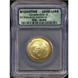 <TABLE cellSpacing=0 cellPadding=0 width="100%" bgColor=#000000 border=0><TBODY> <TR><TD width="100%"><TABLE cellSpacing=1 cellPadding=3 width="100%" border=0><TBODY><TR><TD width="100%" bgColor=#79735c><FONT face=arial color=#ffffff size=3><B>Description</B> </FONT></TD></TR><TR><TD width="100%" bgColor=#ffffff><FONT face=arial size=2><B>Constantine IX.</B></I> A.D. 1042-1055. AV histamenon nomisma (27 mm). Constantinople. Christ seated facing on lyre-backed throne, raising right hand in benediction, holding Gospels in left / Bust of Constantine facing, holding labarum in right hand, globus cruciger in left. DOC 2a; SB 1829. AU53 ICG. </FONT></TD></TR></TBODY></TABLE></TD></TR></TBODY></TABLE><BR><A name=PricesRealized></A><TABLE cellSpacing=0 cellPadding=0 width="100%" bgColor=#000000 border=0><TBODY><TR><TD width="100%"><TABLE cellSpacing=1 cellPadding=3 width="100%" border=0><TBODY><TR><TD width="100%" bgColor=#79735c><A name=PR><FONT face=arial color=#ffffff size=3><B>Previous Prices from Heritage Auctions</B> </FONT></A></TD></TR><TR><TD bgColor=#f6f6ed>No Prior Data Recorded </TD></TR><TR><TD bgColor=#ffffff><FONT face=arial size=1 ?>PLEASE NOTE: All prices realized reflect the final hammer price PLUS the buyer's premium in auctions that charge a buyer's premium. Each item has a notation at the top of the listing indicating whether that lot included a buyer's premium. Example: A item that sells with a final hammer price of $100 and a 20% buyer's premium will display with a price realized of $120. All information listed is intended to be as accurate as possible, but errors are possible. Please use this guide carefully and inform us of any inaccuracies. </FONT></TD></TR></TBODY></TABLE></TD></TR></TBODY></TABLE><BR><TABLE cellSpacing=0 cellPadding=0 width="100%" bgColor=#000000 border=0><TBODY><TR><TD width="100%"><TABLE cellSpacing=1 cellPadding=3 width="100%" border=0><TBODY><TR><TD width="100%" bgColor=#79735c colSpan=6><FONT face=arial color=#ffffff size=3><B>Price Guide*</B> </FONT></TD></TR><TR bgColor=#f6f6ed><TD align=middle><B>Grade</B> </TD><TD align=middle><B>Coin World<BR>(Trends)</B> </TD><TD align=middle><B>Numismedia<BR>Retail</B> </TD><TD align=middle><B>Numismedia<BR>Wholesale</B> </TD><TD align=middle><B>Coin<BR>Universe</B> </TD><TD align=middle><B>Heritage<BR>Value Index</B> </TD></TR><TR bgColor=#ffffff><TD colSpan=6><FONT size=1>*All information listed is intended to be as accurate as possible, but errors are possible. No item may be returned or refused based on this information which is provided as a service to our customers. You should contact each pricing source directly to determine the accuracy of this information. </FONT></TD></TR></TBODY></TABLE></TD></TR></TBODY></TABLE><BR><TABLE cellSpacing=0 cellPadding=0 width="100%" bgColor=#000000 border=0><TBODY><TR><TD width="100%"><TABLE cellSpacing=1 cellPadding=3 width="100%" border=0><TBODY><TR><TD width="100%" bgColor=#79735c><FONT face=arial color=#ffffff size=3><B>Population Guide</B> </FONT></TD></TR><TR bgColor=#ffffff> Important notice: Heritage usually auctions material at the rate of 200-250 lots per hour. On some occasions eBay Live bid software or the Internet may not be able to keep up with the pace of the auction. We recommend placing a realistic absentee bid now as insurance to avoid disappointment. Occasionally the auctioneer may eliminate or reject an eBay Live bid, and the auctioneer may also reopen a lot after the close of the eBay live bidding (usually because we missed an audience bid), and may reject your bid even if it shows you as the winning bidder. By bidding via eBay Live, you agree that Heritage may award the lot to another bidder at its sole discretion under the circumstances described above or any other reasonable circumstances. Also please note that all Heritage lots purchased through eBay Live carry a 20% Buyer's Premium. Please make sure you read the Terms and Conditions before you bid.</TD></TR></TBODY></TABLE></TD></TR></TBODY></TABLE>