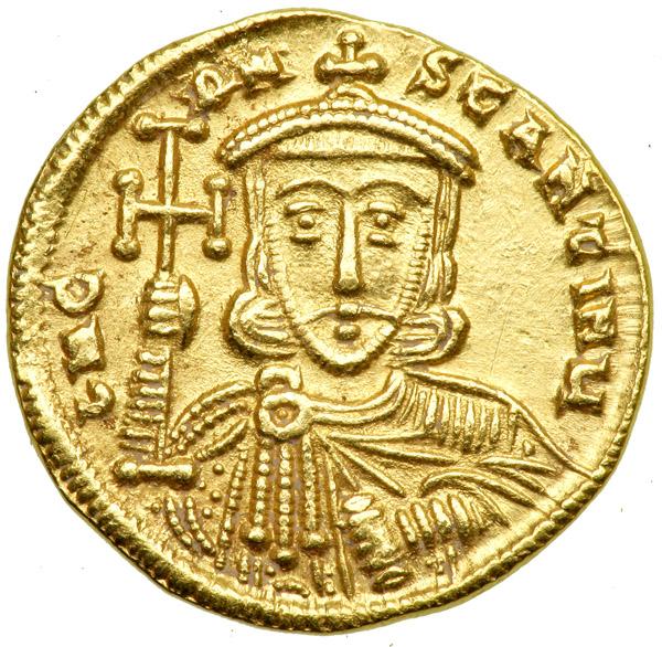 Constantine V, 741-775. Gold Solidus (4.44 g) minted at Constantinople. Bust facing of Constantine V with short beard, holding cross potent and akakia. Reverse: Bust facing of Leo III (father of Constantine V) with short beard, holding cross potent and akakia. D.O. 1c; S. 1550. Scarce. Well centered with two excellent portraits. Extremely Fine. .