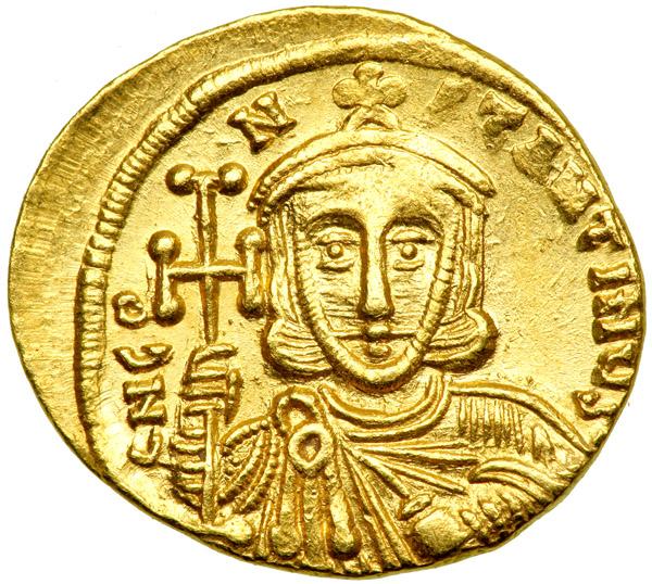 Constantine V, 741-775. Gold Solidus (4.45 g) minted at Constantinople. Bust facing of Constantine V with short beard, holding cross potent and akakia. Reverse: Bust facing of Leo III (father of Constantine V) with short beard, holding cross potent and akakia. D.O. 1d; S. 1550. Scarce. Nearly Extremely Fine.