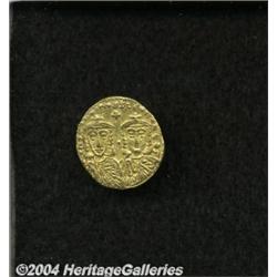 <B>Constantine V and Leo IV.</B></I> A.D. 741-775. AV solidus (20 mm, 4.43 g). Constantinople, A.D. 757-775. Crowned facing busts of Constantine and Leo; cross between / Crowned facing bust of Leo III, holding cross potent on base. DOC 2f; SB 1551. VF. <BR><I>From the Geneva Collection.</B></I> <BR><BR><B>Important notice:</B> Heritage usually auctions material at the rate of 200-250 lots per hour. On some occasions eBay Live bid software or the Internet may not be able to keep up with the pace of the auction. We recommend placing a realistic absentee bid now as insurance to avoid disappointment. Occasionally the auctioneer may eliminate or reject an eBay Live bid, and the auctioneer may also reopen a lot after the close of the eBay live bidding (usually because we missed an audience bid), and may reject your bid even if it shows you as the winning bidder. By bidding via eBay Live, you agree that Heritage may award the lot to another bidder at its sole discretion under the circumstances described above or any other reasonable circumstances. Since eBay bids are not shown to us until we open the lot on the floor, we treat those bids just like floor bids. In most cases the floor responds before the eBay bid is presented to us, due to Internet lag time, so for consistency we have made it a policy that floor bids are always considered first over tie eBay live bids. Also please note that all Heritage lots purchased through eBay Live carry a 20% Buyer's Premium. Please make sure you read the Terms and Conditions before you bid.