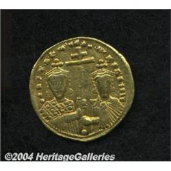 <B>Constantine VII, with Romanus II.</B></I> A.D. 913-959. AV solidus (20 mm, 3.91 g). Constantinople, A.D. 945-959. Nimbate bust of Christ facing, raising right hand in benediction and holding Gospels / Crowned facing busts of Constantine VII on left and Romanus II on right, holding patriarchal cross between them. DOC 15; SB 1751. Near XF. The odd style and light weight suggests this is a contemporary imitation.<BR><I>From the Geneva Collection.</B></I> <BR><BR><B>Important notice:</B> Heritage usually auctions material at the rate of 200-250 lots per hour. On some occasions eBay Live bid software or the Internet may not be able to keep up with the pace of the auction. We recommend placing a realistic absentee bid now as insurance to avoid disappointment. Occasionally the auctioneer may eliminate or reject an eBay Live bid, and the auctioneer may also reopen a lot after the close of the eBay live bidding (usually because we missed an audience bid), and may reject your bid even if it shows you as the winning bidder. By bidding via eBay Live, you agree that Heritage may award the lot to another bidder at its sole discretion under the circumstances described above or any other reasonable circumstances. Since eBay bids are not shown to us until we open the lot on the floor, we treat those bids just like floor bids. In most cases the floor responds before the eBay bid is presented to us, due to Internet lag time, so for consistency we have made it a policy that floor bids are always considered first over tie eBay live bids. Also please note that all Heritage lots purchased through eBay Live carry a 20% Buyer's Premium. Please make sure you read the Terms and Conditions before you bid.