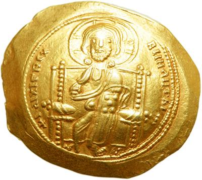 Constantine X, 1059-1067. Gold Histamenon Nomisma (4.36 g) minted at Constantinople. Christ seated on throne, raising right hand in benediction; in left hand, book of Gospels. Reverse: Constantine standing, holding labarum and globus cruciger. D.O. 1; S. 1847. Natural mint flaw on outer edge at eight o'clock of reverse. Well struck; Extremely Fine.