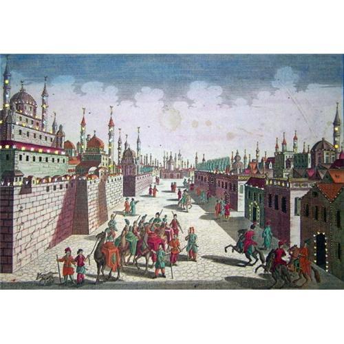 This perspective view ( vue perspective, vue d'optique, or guckkastenblättern ) of Constantinople ( Instanbul ) features dramatic hold-to-light features and hand-coloring. Shown here in bright daylight and with back-lighting to illustrate the hold-to-light effects. Believed to date from circa 1770. Text on rear in French and Latin reads " Prospectus, quem exhibet Mechemeti et Selimu, Sultanorum, Moschaea in urbe Constantinopolitana. Vue aupres de la Mosquee du Sultan Mechemet et de Selim a Constantinople. Med Fol No. 54 ". Source of the print is unknown. Entire sheet measures 12 1/2 by 17 3/8 inches and the printed area measures 11 by 15 3/4 inches. Thanks for visiting. Please let us know if you have any questions or comments.