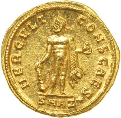Constantius I, as Caesar, AD 293-305. Gold Aureus (5.4 g) minted at Antioch, c. AD 293-5. Laureate head right of the bearded Constantius. Reverse: Hercules standing facing, head left, holding club and apples; lion skin draped over right shoulder. RIC VI, p. 613, 8 [as R4]. Virtually Mint State.