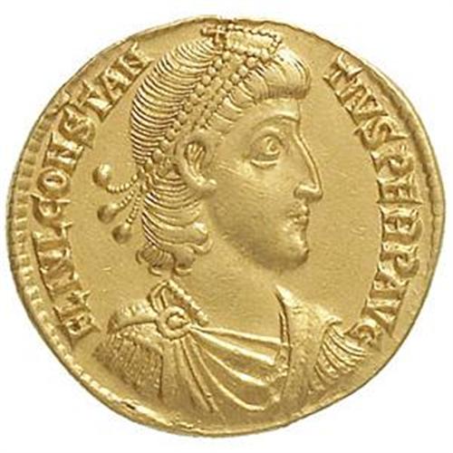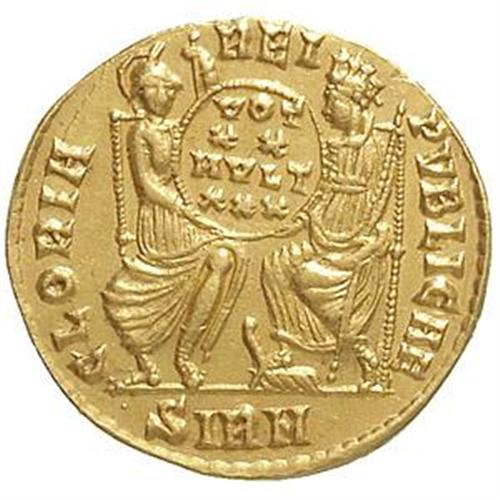 Roman Empire Coins. Constantius II (337-361). Solido, Sirmium. D/ FL IVL CONSTANTIVS PERP AVG. Busto diademato, drappeggiato e corazzato a destra. R/ GLORIA REI PVBLICAE. Roma e Constantinople, sedute in trono, tengono scudo con iscrizione VOT/XX/MVLT/XXX. In esergo: SIRM. RIC 1. gr. 3.96 RR. AU. qSPL-SPL.