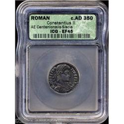 <TABLE cellSpacing=0 cellPadding=0 width="100%" bgColor=#000000 border=0><TBODY> <TR><TD width="100%"><TABLE cellSpacing=1 cellPadding=3 width="100%" border=0><TBODY><TR><TD width="100%" bgColor=#79735c><FONT face=arial color=#ffffff size=3><B>Description</B> </FONT></TD></TR><TR><TD width="100%" bgColor=#ffffff><FONT face=arial size=2><B>Constantius II.</B></I> A.D. 337-361. AE centenionalis (21 mm). Siscia, under Vetranio, A.D. 350.Diademed, draped and cuirassed bust right; A behind, star before / Constantius standing left, holding a labarum in each hand; A/.(Gamma)SIS.. RIC 284; LRBC 1171. XF45 ICG. </FONT></TD></TR></TBODY></TABLE></TD></TR></TBODY></TABLE><BR><A name=PricesRealized></A><TABLE cellSpacing=0 cellPadding=0 width="100%" bgColor=#000000 border=0><TBODY><TR><TD width="100%"><TABLE cellSpacing=1 cellPadding=3 width="100%" border=0><TBODY><TR><TD width="100%" bgColor=#79735c><A name=PR><FONT face=arial color=#ffffff size=3><B>Previous Prices from Heritage Auctions</B> </FONT></A></TD></TR><TR><TD bgColor=#f6f6ed>No Prior Data Recorded </TD></TR><TR><TD bgColor=#ffffff><FONT face=arial size=1 ?>PLEASE NOTE: All prices realized reflect the final hammer price PLUS the buyer's premium in auctions that charge a buyer's premium. Each item has a notation at the top of the listing indicating whether that lot included a buyer's premium. Example: A item that sells with a final hammer price of $100 and a 20% buyer's premium will display with a price realized of $120. All information listed is intended to be as accurate as possible, but errors are possible. Please use this guide carefully and inform us of any inaccuracies. </FONT></TD></TR></TBODY></TABLE></TD></TR></TBODY></TABLE><BR><TABLE cellSpacing=0 cellPadding=0 width="100%" bgColor=#000000 border=0><TBODY><TR><TD width="100%"><TABLE cellSpacing=1 cellPadding=3 width="100%" border=0><TBODY><TR><TD width="100%" bgColor=#79735c colSpan=6><FONT face=arial color=#ffffff size=3><B>Price Guide*</B> </FONT></TD></TR><TR bgColor=#f6f6ed><TD align=middle><B>Grade</B> </TD><TD align=middle><B>Coin World<BR>(Trends)</B> </TD><TD align=middle><B>Numismedia<BR>Retail</B> </TD><TD align=middle><B>Numismedia<BR>Wholesale</B> </TD><TD align=middle><B>Coin<BR>Universe</B> </TD><TD align=middle><B>Heritage<BR>Value Index</B> </TD></TR><TR bgColor=#ffffff><TD colSpan=6><FONT size=1>*All information listed is intended to be as accurate as possible, but errors are possible. No item may be returned or refused based on this information which is provided as a service to our customers. You should contact each pricing source directly to determine the accuracy of this information. </FONT></TD></TR></TBODY></TABLE></TD></TR></TBODY></TABLE><BR><TABLE cellSpacing=0 cellPadding=0 width="100%" bgColor=#000000 border=0><TBODY><TR><TD width="100%"><TABLE cellSpacing=1 cellPadding=3 width="100%" border=0><TBODY><TR><TD width="100%" bgColor=#79735c><FONT face=arial color=#ffffff size=3><B>Population Guide</B> </FONT></TD></TR><TR bgColor=#ffffff> Important notice: Heritage usually auctions material at the rate of 200-250 lots per hour. On some occasions eBay Live bid software or the Internet may not be able to keep up with the pace of the auction. We recommend placing a realistic absentee bid now as insurance to avoid disappointment. Occasionally the auctioneer may eliminate or reject an eBay Live bid, and the auctioneer may also reopen a lot after the close of the eBay live bidding (usually because we missed an audience bid), and may reject your bid even if it shows you as the winning bidder. By bidding via eBay Live, you agree that Heritage may award the lot to another bidder at its sole discretion under the circumstances described above or any other reasonable circumstances. Also please note that all Heritage lots purchased through eBay Live carry a 20% Buyer's Premium. Please make sure you read the Terms and Conditions before you bid.</TD></TR></TBODY></TABLE></TD></TR></TBODY></TABLE>