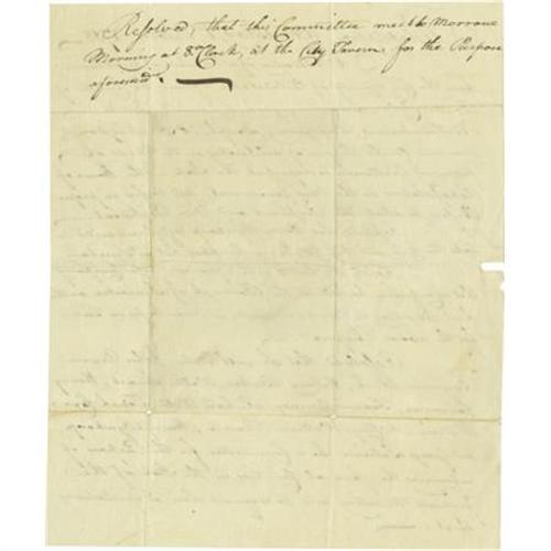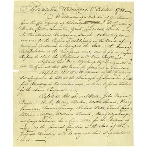 <B> Constitution 1788 Manuscript Notes from a Philadelphia Committee Meeting.</B></I> 1¼ pages, 7.5" x 9.25", plain paper, Philadelphia, October 1, 1788. A group of important early Pennsylvania patriots meet to deliberate on how to elect representatives to the new U.S. Congress and who to pick to elect the president and vice president. It reads, in full, <BR><BR>"<I>At a Meeting of a number of Gentlemen from the City & County of Philadelphia & from the Counties of Bucks, Chester, Lancaster, York, Cumberland, Berks, Northumberland, Montgomery, Dauphin & Huntingdon, convened for the Purpose of deliberating on the Mode of procuring Gentlemen to represent this State in the House of Representatives in the New Government, and to fix on proper Persons to elect the President and Vice President. <BR><BR>Resolved, that Henry Wynkoop Esqr. be requested to take the Chair and that Mr. James Campbell act as Secretary.<BR><BR>Resolved, that it is the Opinion of this Company that a Conference be held at the Borough of Lancaster on the first Monday in November next, in Order to fix on Tickets for the above Purpose.<BR><BR>Resolved, that Samuel Miles, John Nixon, Benjamin Rush, Hilary Baker, Walter Stuart, Henry Kammerer, Francis Gurney, Richard Wells, Tench Coxe, William McClay, William Rawle, Henry Wynkoop, and George Latimer be a Committee for the Purpose of informing the several Counties in the State of the proposed Meeting and to request their Deputations to it. <BR><BR>Resolved, that this Committee meet tomorrow Morning at 8.oClock, at the City Tavern for the Purpose aforesaid.</B></I>"<BR><BR>This important document certainly appears to be contemporary to the date noted. It is not signed, but very likely is in the hand of one of the important founding fathers named in the document (which reads like a "Who's Who" of early Pennsylvania politics). Many of the named individuals were in the delegation that ratified the U.S. Constitution just a few months earlier. Good condition with wear and separation at some of the folds, yet the writing is bold and legible. Worthy of detailed research.<BR><BR><BR><b>Shipping:</b> Flat Material, Small (<a target="_blank" href="http://www.heritageauctions.com/common/shipping.php">view shipping information</a>)
