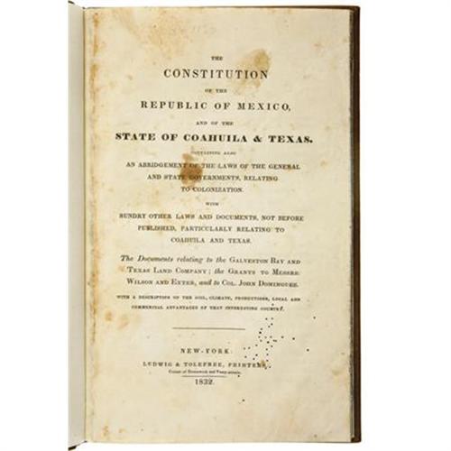 <B>The Constitution of the Republic of Mexico, and of the State of Coahuila & Texas.</B></I> New York: Ludwig & Tolefree, Printers. 1832. Containing also an <I>Abridgement of the Laws of the General and State Governments, relating to Colonization. With Sundry Other Laws and Documents, Not Before Published, Particularly relating to Coahuila and Texas</B></I>, as well as <I>The Documents relating to the Galveston Bay and Texas Land Company; the Grants to Messrs. Wilson and Exter, and to Col. John Dominguez. With a description of the soil, climate, productions, local and commercial advantages of that interesting country.</B></I> 113 p. Octavo. <BR><BR>The author of this early work, Asahel Langworthy, was a graduate of the University of Vermont, Burlington (1805). He was a captain in the War of 1812 and fought in the battle at Plattsburg. He later became a lawyer in New York City, and then turned to land speculation. He died in 1835. In his preface dated New-York, December 30, 1831, Langworthy remarks, "<I>The undersigned has, during the last year, traveled considerably over Texas, and has taken great pains to collect information to enable him to form a correct opinion in regard to that country</B></I>." He is known to have purchased 100,000 acres of land from the Galveston Bay and Texas Land Company, but little else is known of him. In addition to the material directly relating to land companies referred to in the title, this work also includes a description of the grants made in 1831 to the Arkansas and Texas Land Company. Full gilt-lettered leather. Minor to moderate age toning and foxing, else fine. <I>From the collection of Darrel Brown.</B></I><BR><BR><B>Reference: </B></I>Streeter <I>Texas</B></I> 1130. Sabin 94946. Howes C504, "aa". Eberstadt 162:478.<BR><BR><b>Shipping:</b> Books & Catalogs (<a target="_blank" href="http://www.heritageauctions.com/common/shipping.php">view shipping information</a>)