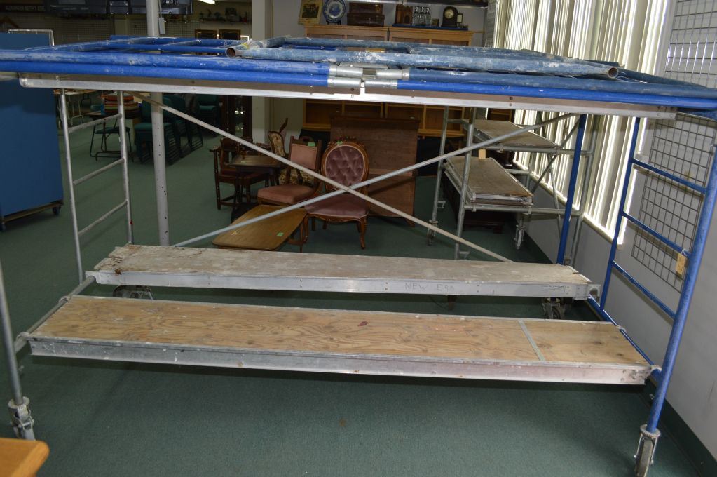 Construction grade scaffolding including seven 5'X5' frames, four 10' decks, four wheels and five cross braces