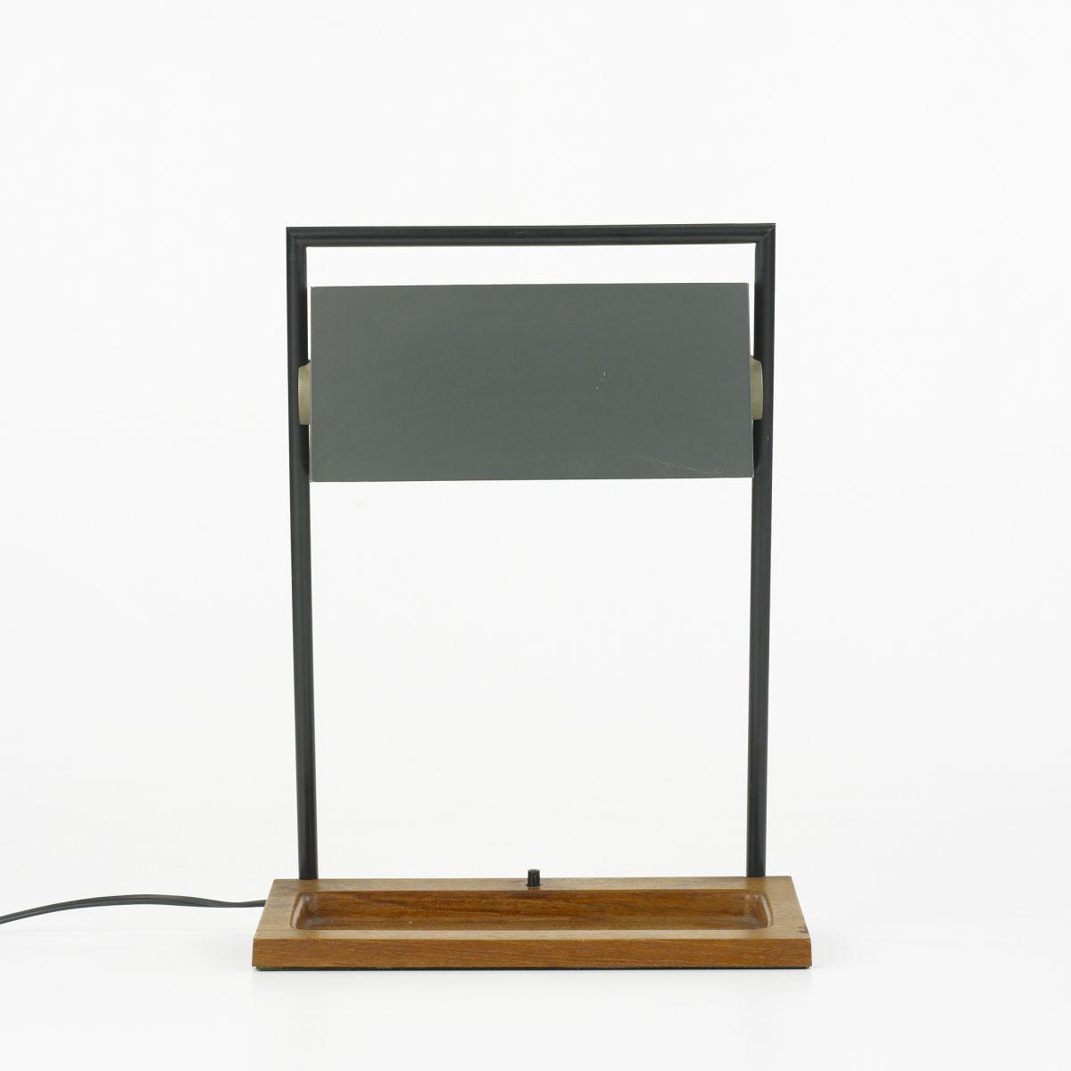 teak, enameled steel, brass, plastic