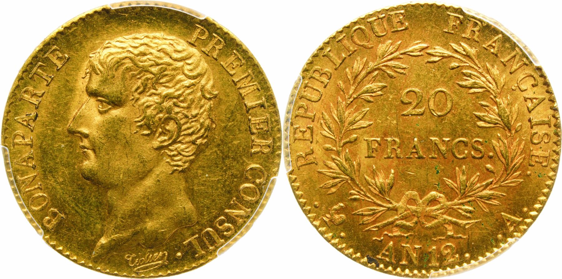Consulat 1799-1804, 20 Francs, Paris, AN 12 A, AU 6.45 g. Ref : G. 1020, Fr. 480 Grading : PCGS MS