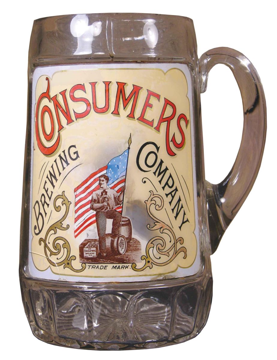 Consumers Brewing Company, label under glass display mug. A crack lower left hand corner and minor discoloration, small chip to lip and a one inch factory flaw at the top of the mug, very good condition. 10 inches tall X 8 inches wide with handle.
