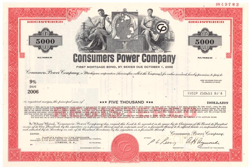 [SPECIMEN] ----, Michigan. 9% first mortgage bond specimen in Consumers Power Company. Red / Black. Vignette of two allegorical males at top center. Perforation cancellation. Overall Fine.