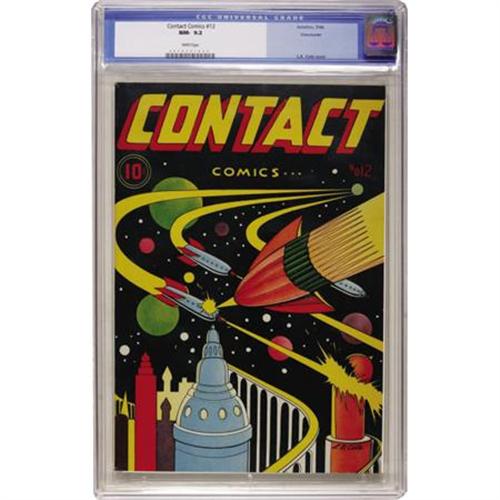 <B>Contact Comics #12 Vancouver pedigree (Aviation Press, 1946) CGC NM- 9.2 White pages.</B></I> This ranks as one of our very favorite of L. B. Cole's covers, and that's high praise because we love dozens of 'em! That alone would create lots of collector competition in finding copies of #12, but it also happens to be one of the rarest issues in this title's run. We've got CGC's highest-graded copy right here, so we'll step back and let y'all fight over it! Sky Rangers, Air Kids, and Ace Diamond appear. Overstreet 2007 NM- 9.2 value = $1,275. CGC census 6/07: 1 in 9.2, none higher.<BR><BR><b>Shipping:</b> Comics - Slabbed (certified) (<a target="_blank" href="http://www.heritageauctions.com/common/shipping.php">view shipping information</a>)