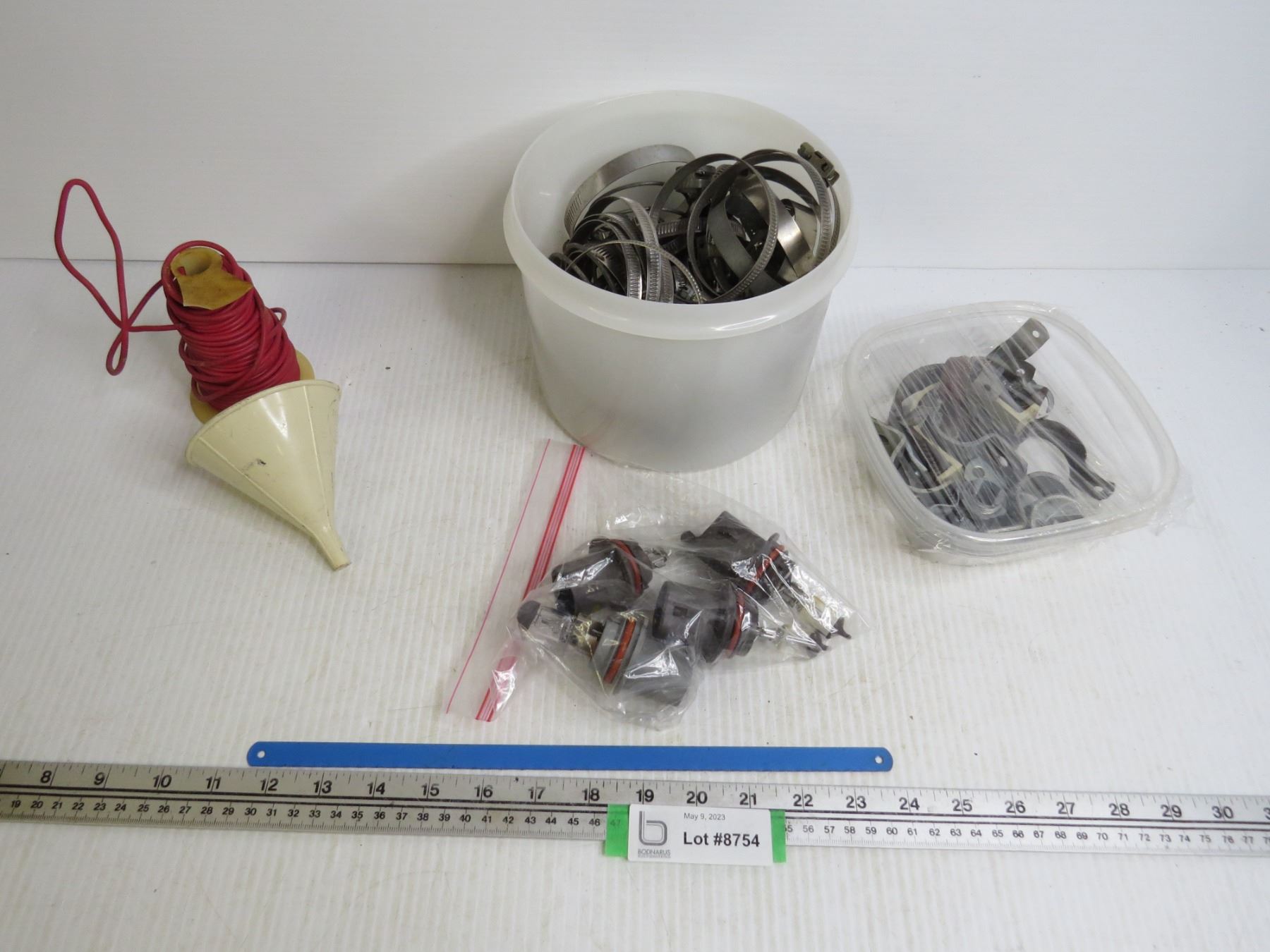 Container of Clamps - Wire - Headlight Bulbs - Funnel - Hacksaw Blade - Pipe Holders