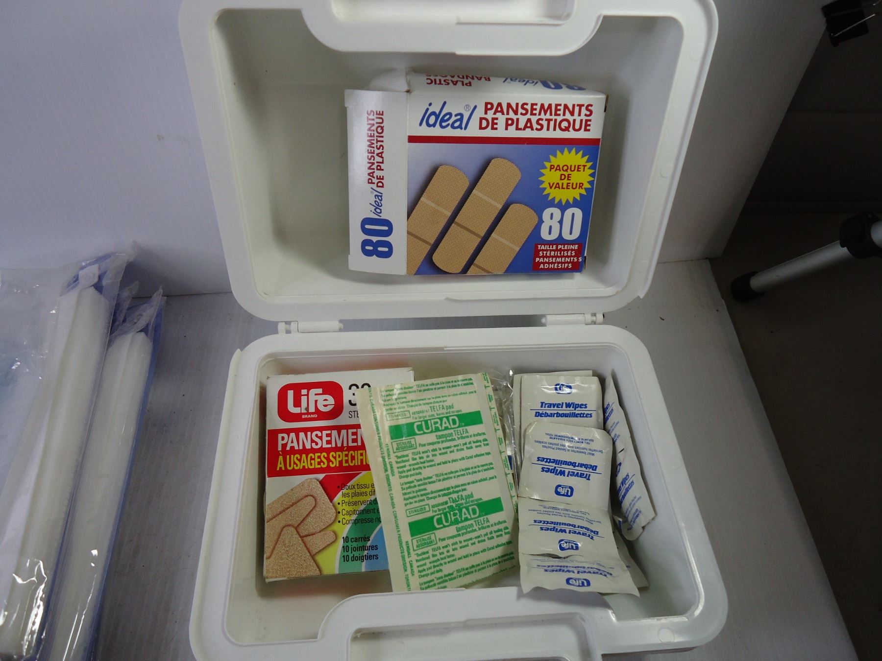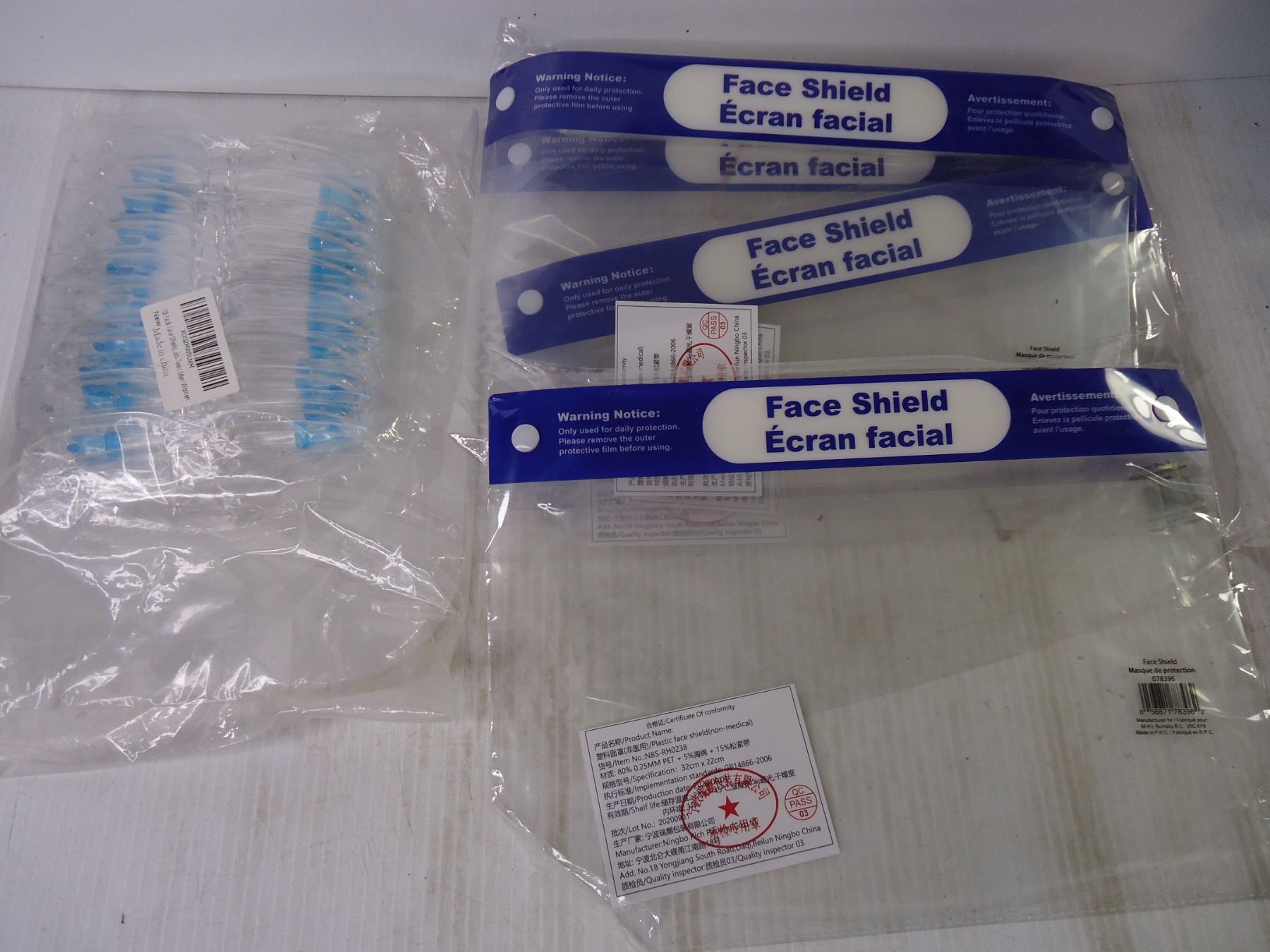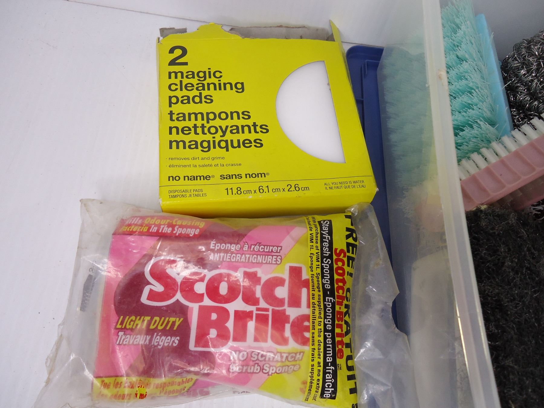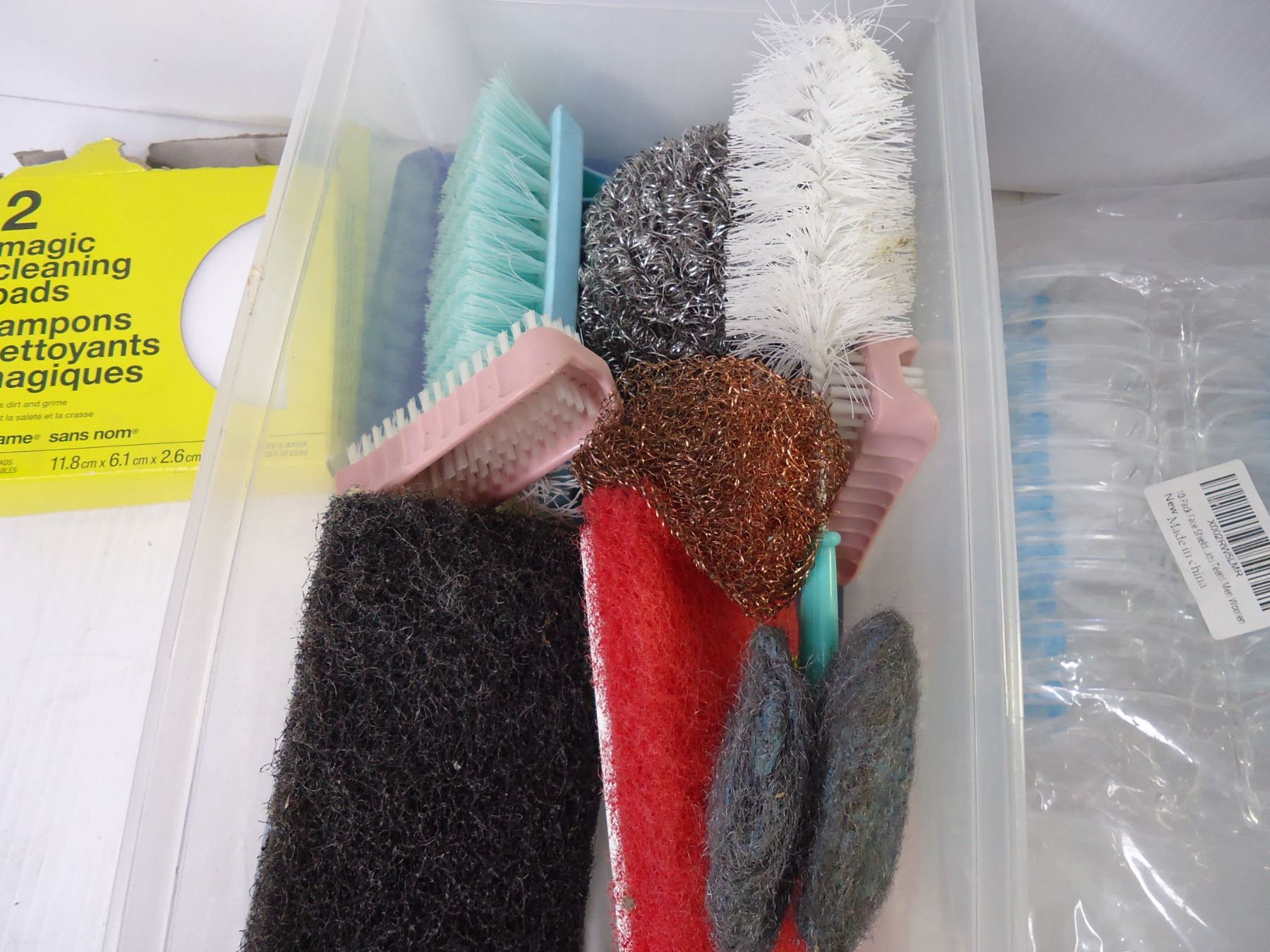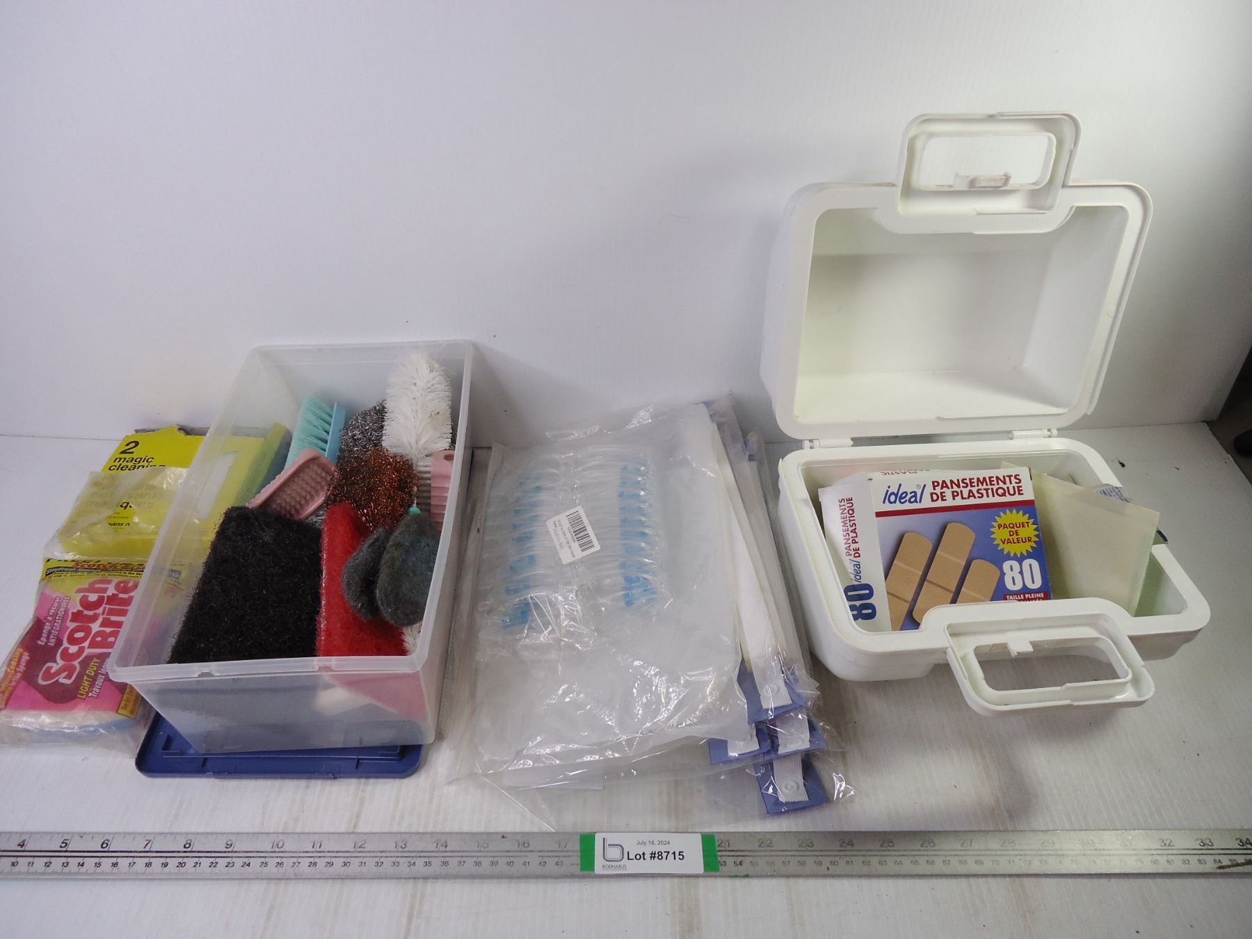 Container of Cleaning Scrubbers, Bandages and lot of Plastic Face Shields