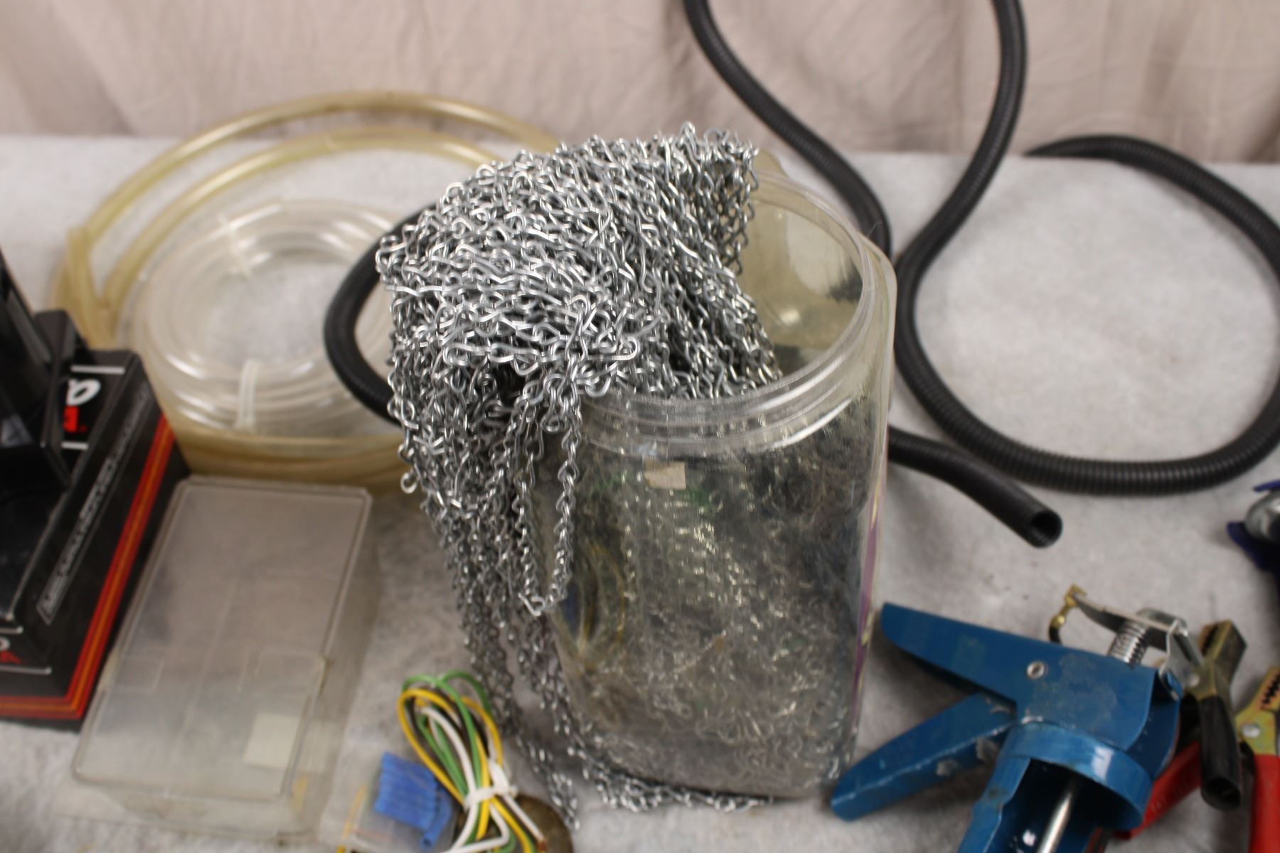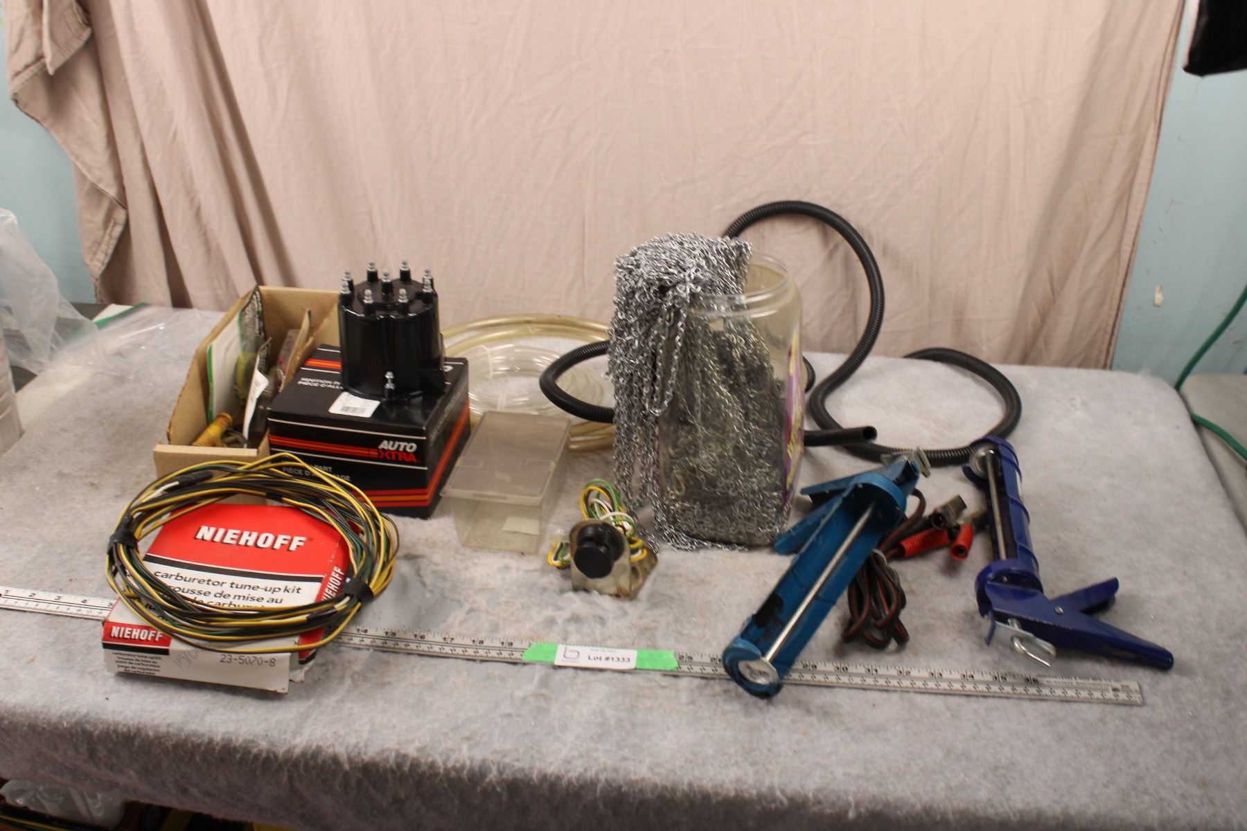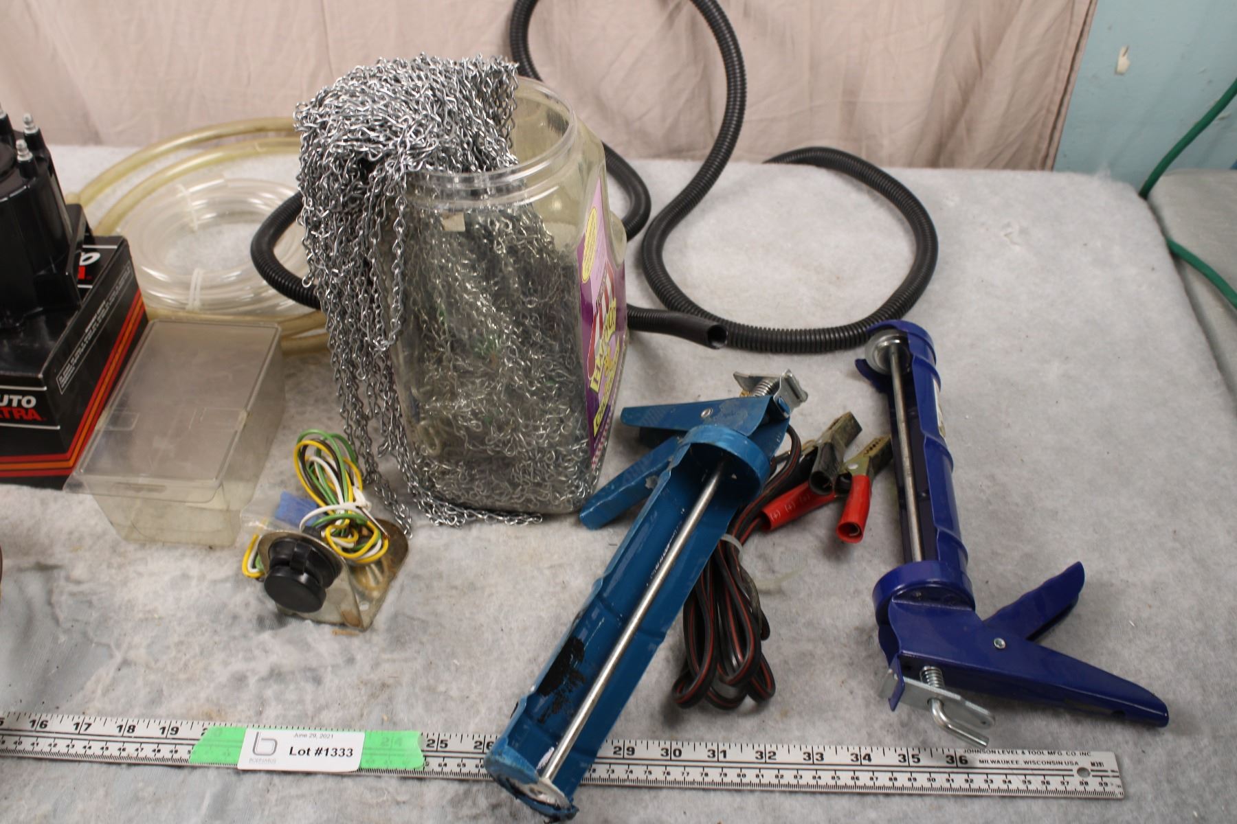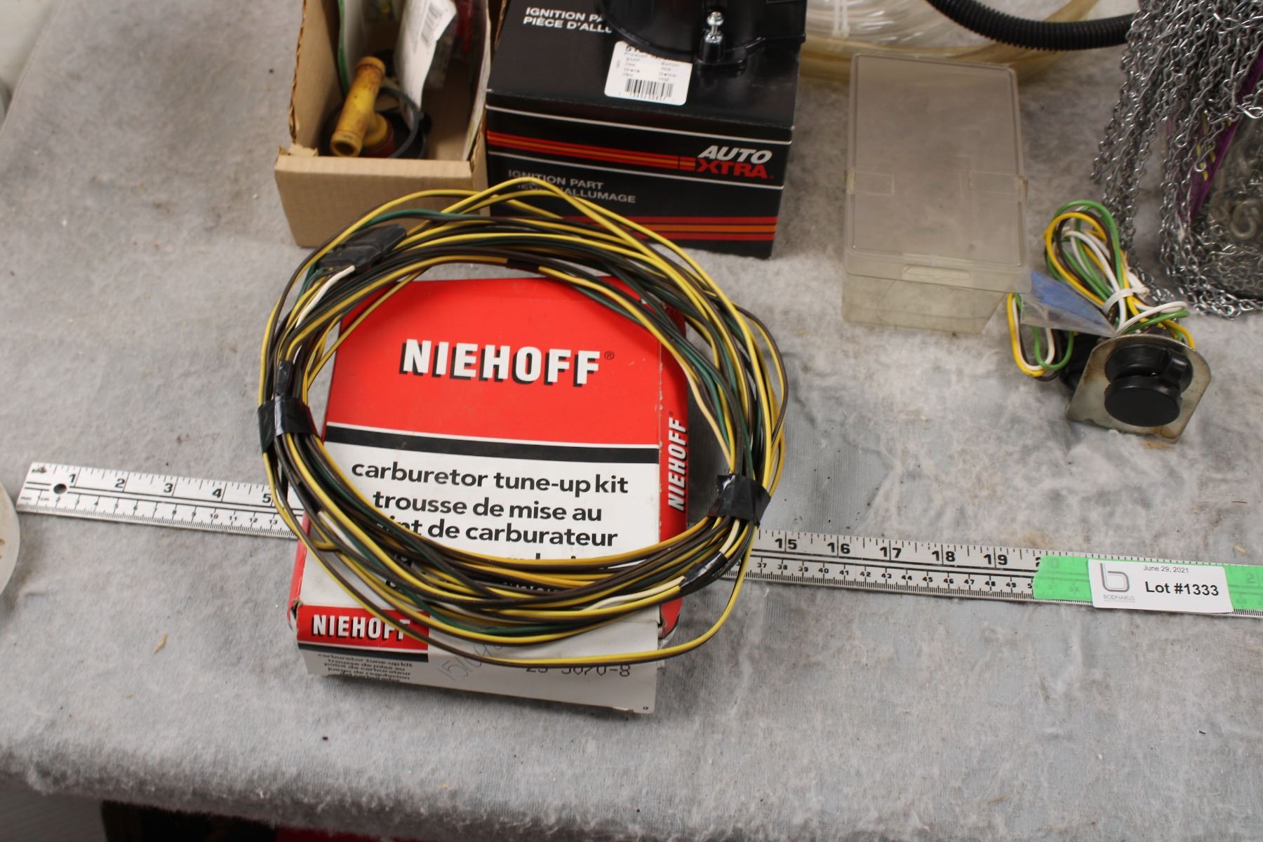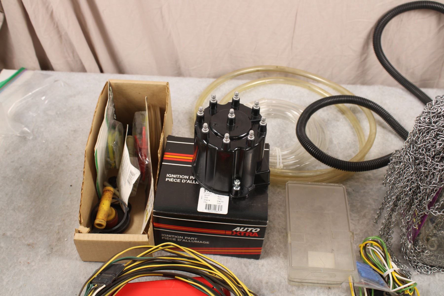 Container with chain, trailer wire, carb kit, distributor cap, misc garage items