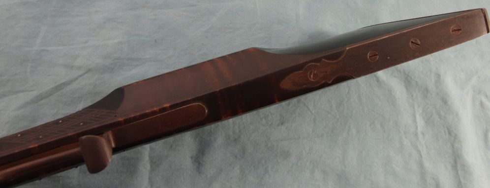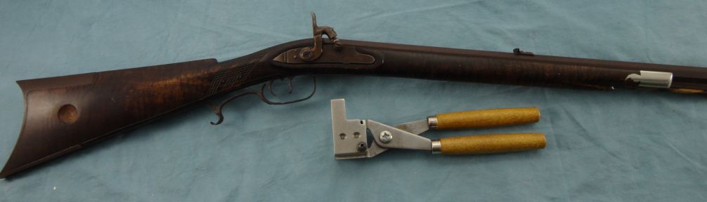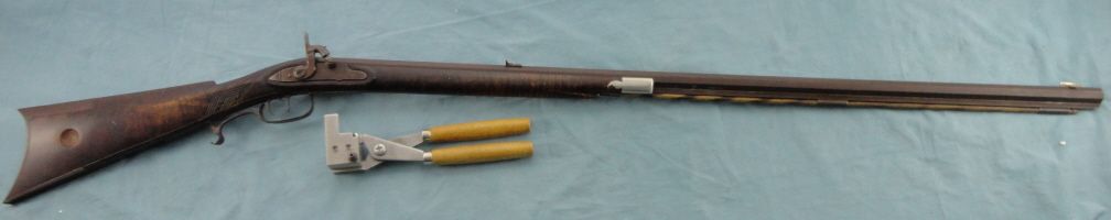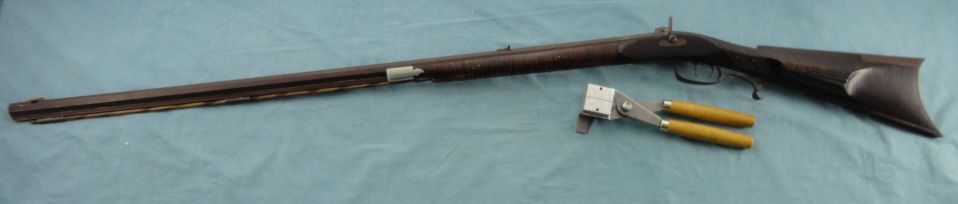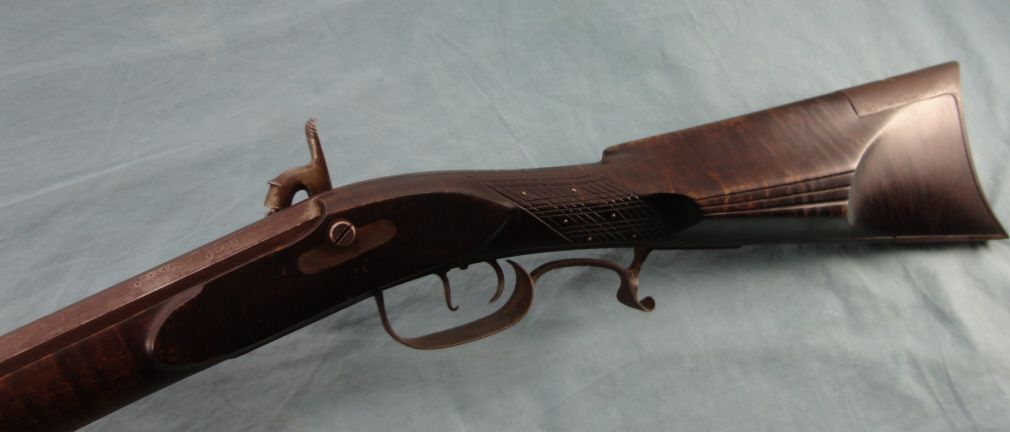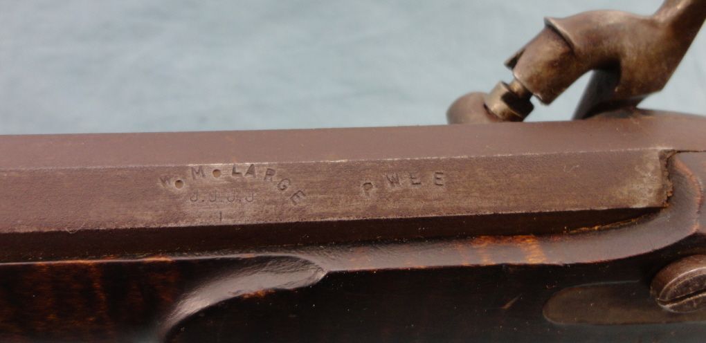 #Blackpowder, 30 cal W.M. Large marked Bbl. 38" oct. bbl. marked "Wm Large". Tiger stripped 1/2 stock . Raised cheek piece. Browned metal parts & dbl. set triggers. In very good overall condition.