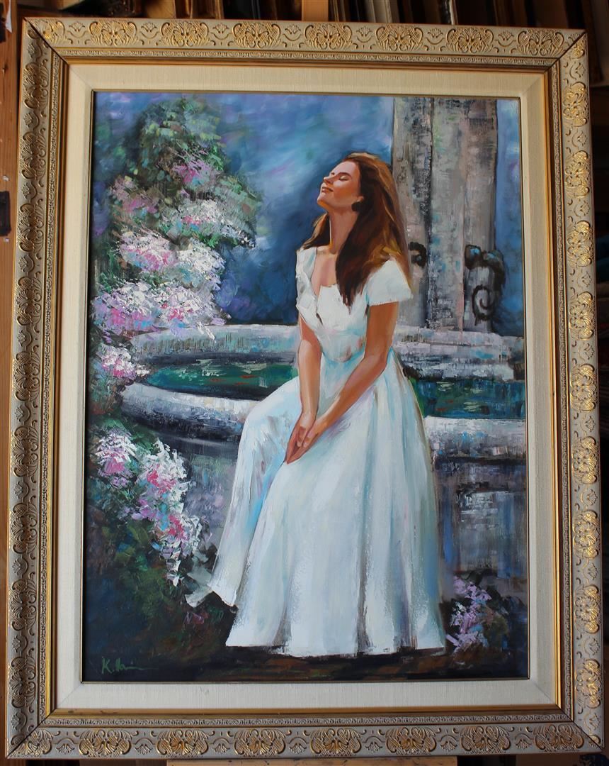 Kay Harris paints a beautiful woman dressed in white, who daydreams by a blissful water fountain, The oil on canvas measures 40 x 30; framed painting measures approx. 52 x 42.