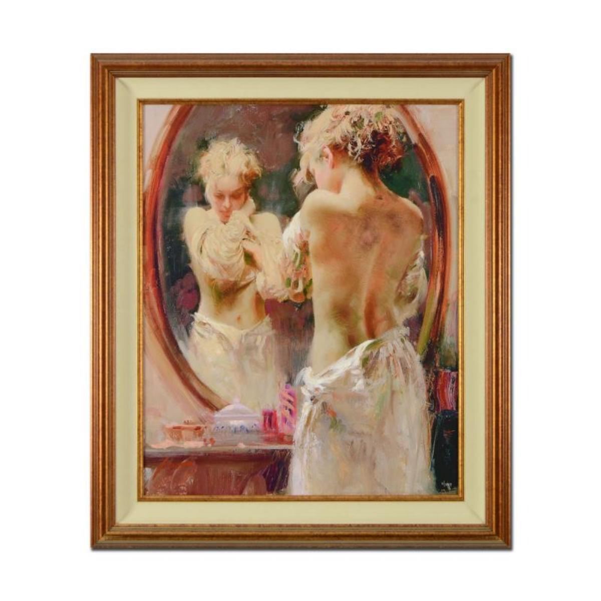 Pino's portraits allow glimpses into intensely personal, intimate spaces, conveying emotion through rich, warm color and sensual brushwork. "Contemplation" is an artist-embellished limited edition giclee on canvas by Pino (1939-2010). The piece is numbered, hand signed, custom framed, and includes certificate of authenticity. Measures approx. Measures approx. 32" x 37.5" (frame), 24" x 30" (image).