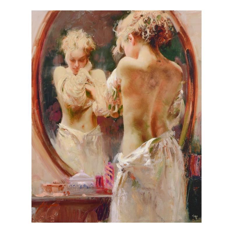 Pino's portraits allow glimpses into intensely personal, intimate spaces, conveying emotion through rich, warm color and sensual brushwork. "Contemplation" is a hand embellished limited edition giclee on canvas by Pino (1939-2010). The piece is numbered, hand signed, and includes certificate of authenticity. Measures approximately 30" x 24" (image).