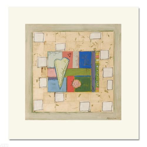 Maria Eva uses a combination of bold color blocks and delicate brushwork to create visual interest in her work and a style that stands out. "Contemplative" is an original mixed media painting on paper, hand signed by Maria Eva! Please note this piece has a large border that may need to be trimmed before framing. Measures approx. 27" x 37" (with border), 20" x 20" (image).
