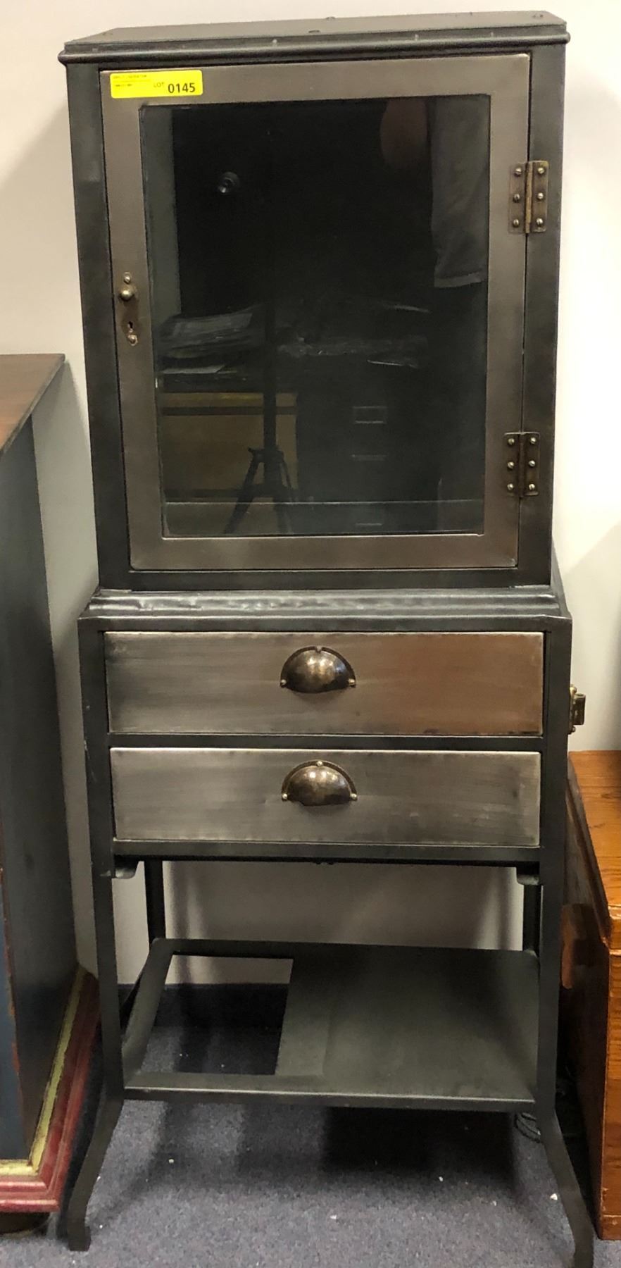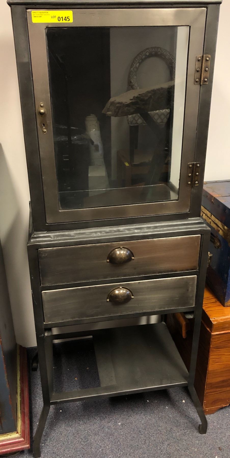 Contemporary 2 drawer metal side cabinet w/ display cabinet on top - approx. 23 1/2in wide x 16in depth x 62in height