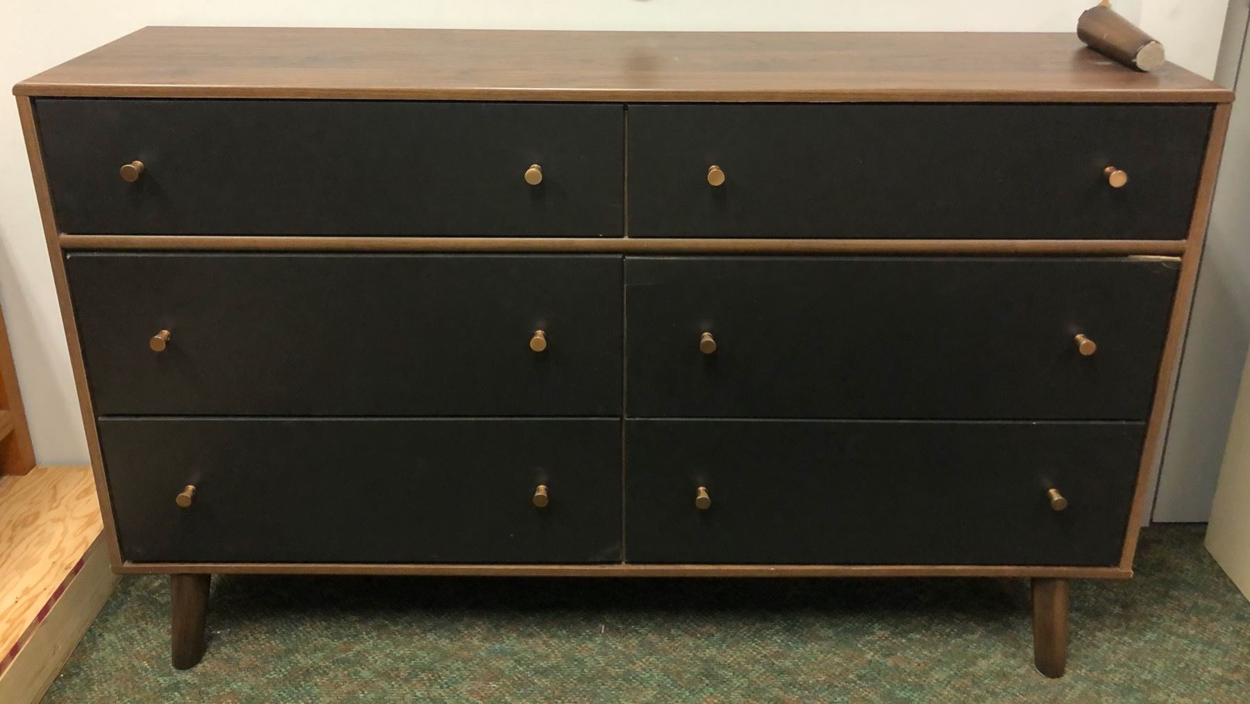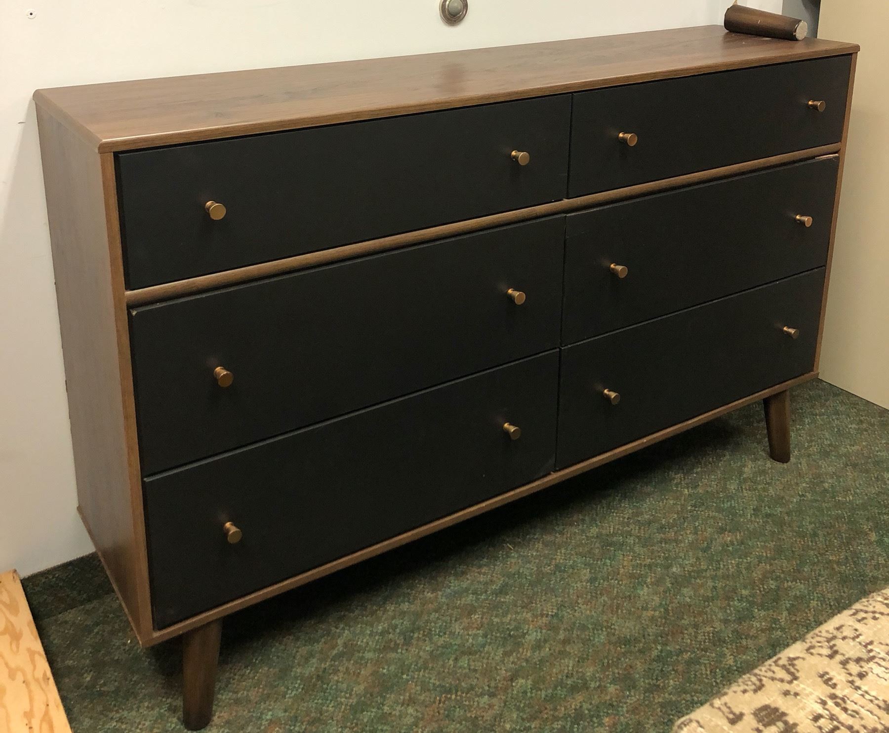 Contemporary 6 drawer dresser - approx. 5ft wide x 15 1/2in depth x 37in height (1 leg needs minor repair)