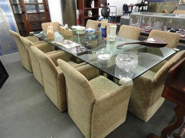 Contemporary 9' Glass Ped. Dining Table w/10 Fabric Arm Chairs