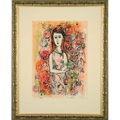 This awe striking Modern painting is attractively matted with a cream colored mat that subtly enhances the lucid colors of the painting and allows the colors to stand out. The gold, wood, ornate frame also improves the look of the piece by imitating the smooth, flowing line work in the painting. The entire picture measures 33? x 26.75?. An excellent buy for any art enthusiast.