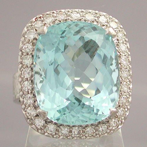 Modern lady's aquamarine and diamond dinner ring in a rectangular cushion shape design with a textured shank. The raised top is set with a rectangular cushion cut genuine aquamarine calculated to weigh approx. 22.00 carats. This is light to slightly medium robin's egg blue. This is surrounded by twenty-eight (28) single cut diamonds weighing approx. 0.56 carats, total. In all, a large dramatic and showy piece. Has inside ring, removeable.