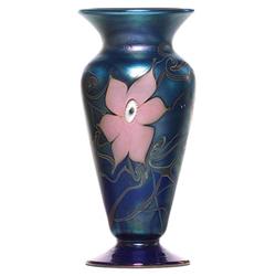 Contemporary Art Glass vase, footed from in blue iridescent glass with pink floral designs, unmarked, 9”h