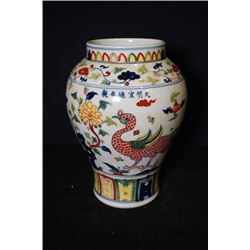 A blue-and-white & green-and-red "phoenix cross peony" stem jar
