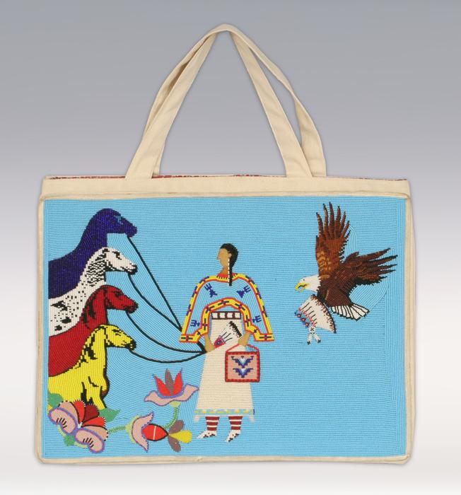 Contemporary Canvas Bag. With Fully Beaded Pictorial Front. 13 1/2" x 17 1/2". Probably Plateau area. Beautiful work. Condition Report: New