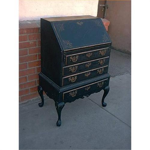Contemporary Black with Gold Trim Drop Front Secretary. This is a well made secretary. Secretary has four Queen Ann style legs, 4 draws, pigeon whole and a hand painted gold trim design. Secretary measures 40" tall by 26.5" wide by 16.5" deep with a 18.5" writing space. Great for any room.