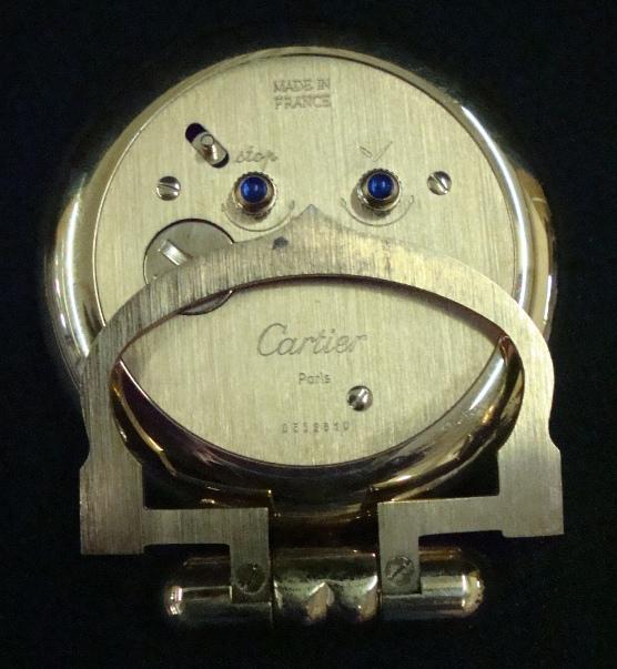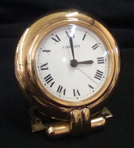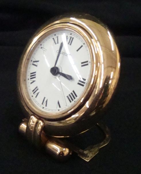 Fine and rare gold plated Cartier Clock in a three piece circular form case with hinged folding stand. Signed on the back Made in France. Cartier Serial #0538210. Measures 3-1/4by 4"
