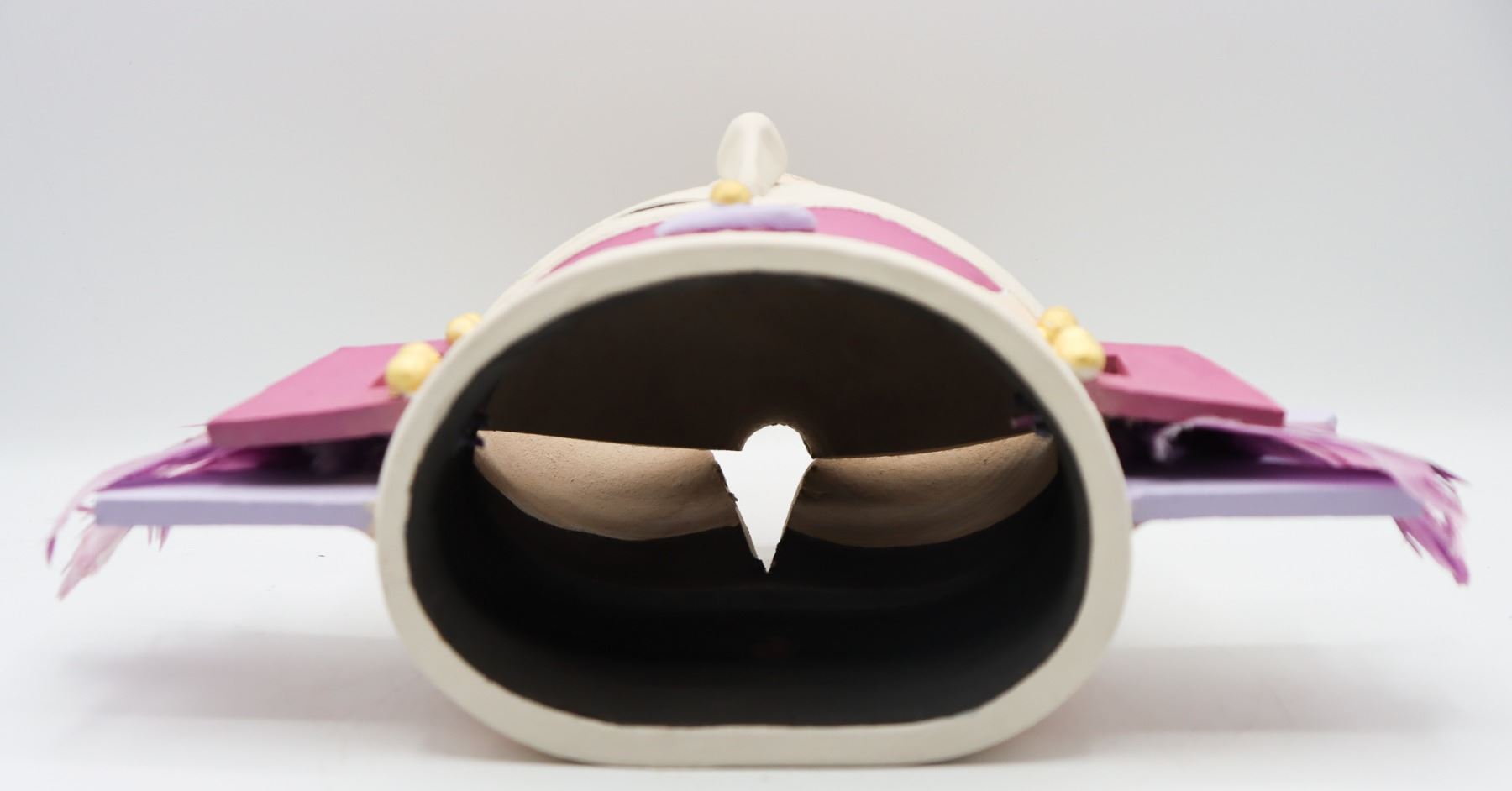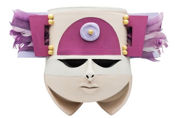 Painted pottery, this colorful piece has the look of an Aztec warrior face, complete with beads and feathers. Signed indistinctly in the clay.