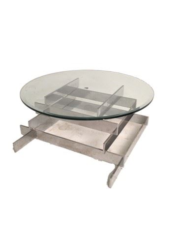 Contemporary metal base with glass top (with center cut 1/2" hole) low rise coffee table. Glass top: 30" diameter. Height of base:13".