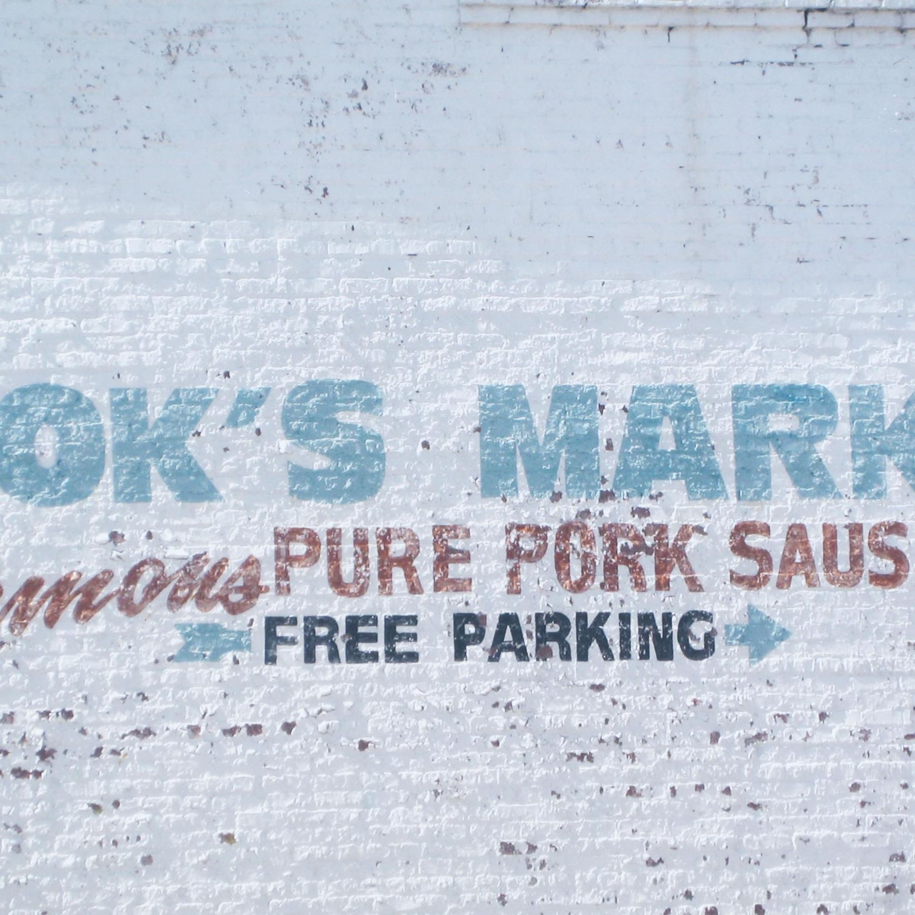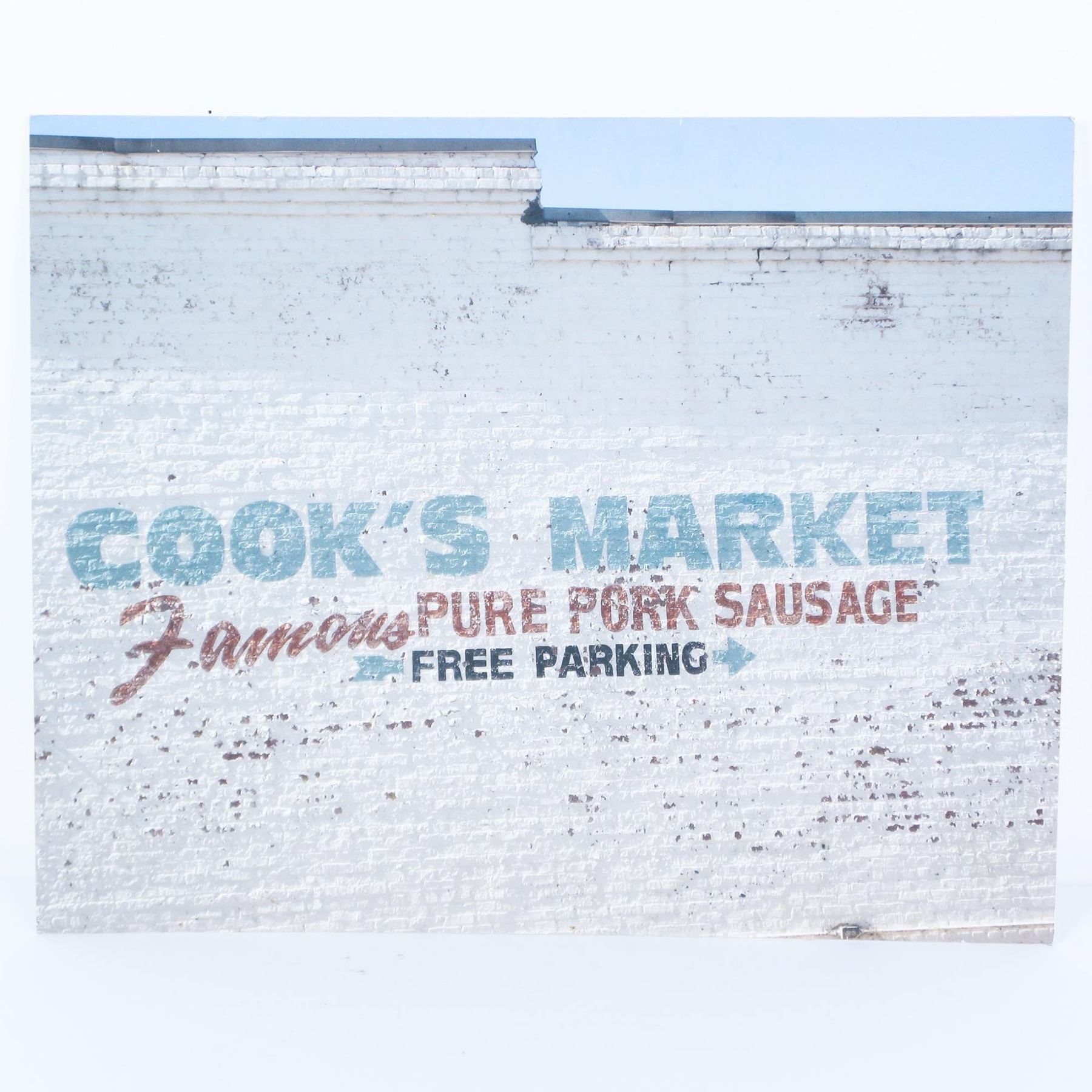 Contemporary original color photograph applied to board featuring a close-up shot of the advertisement for the makers of pork sausage painted on the wall of the Cook's Market in Thomaston Georgia. Artwork dimensions: 20.50"L x 16.50"H.