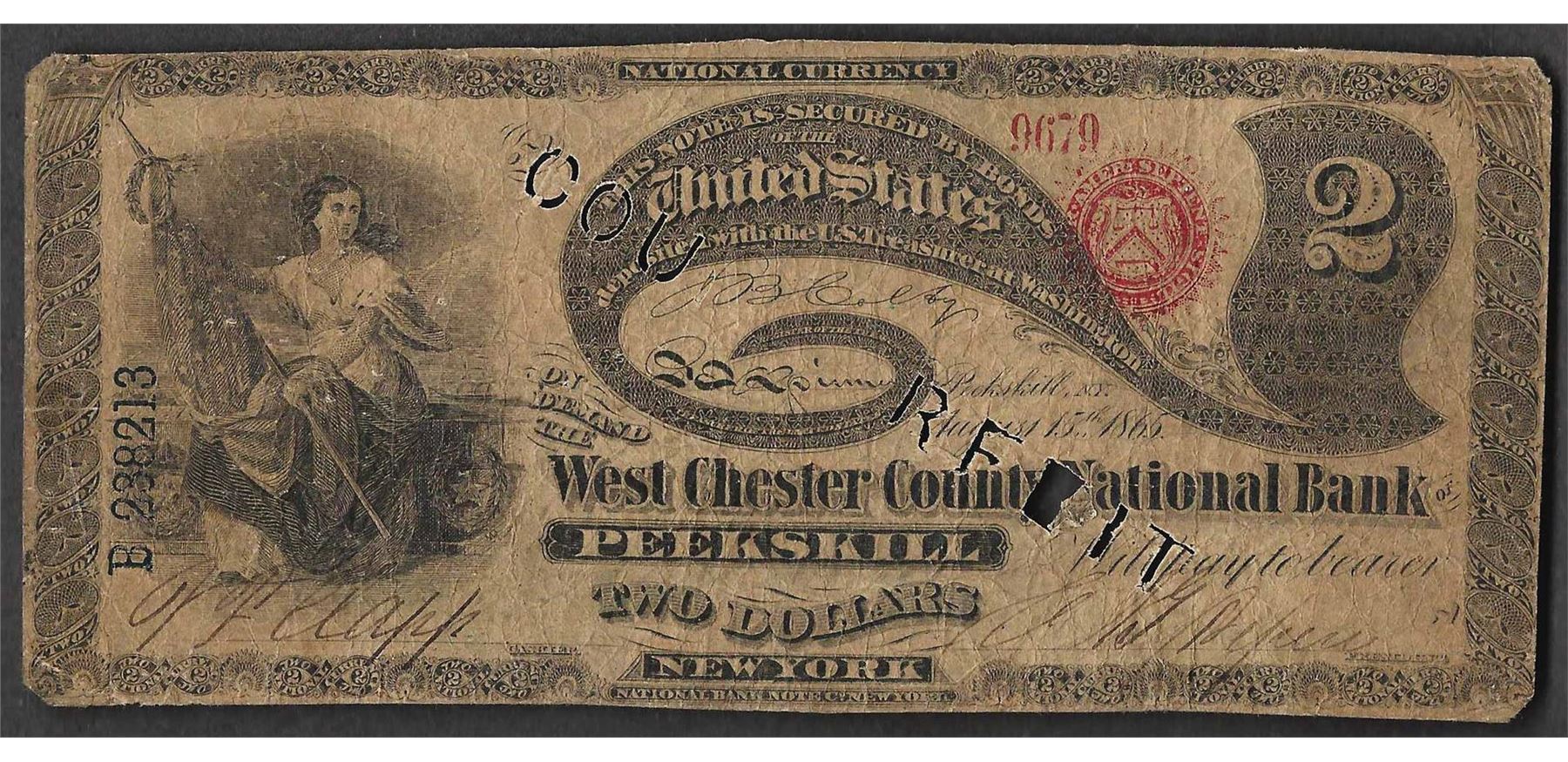 One Contemporary Counterfeit 1865 $2 Lazy Deuce West Chester National Bank Note.