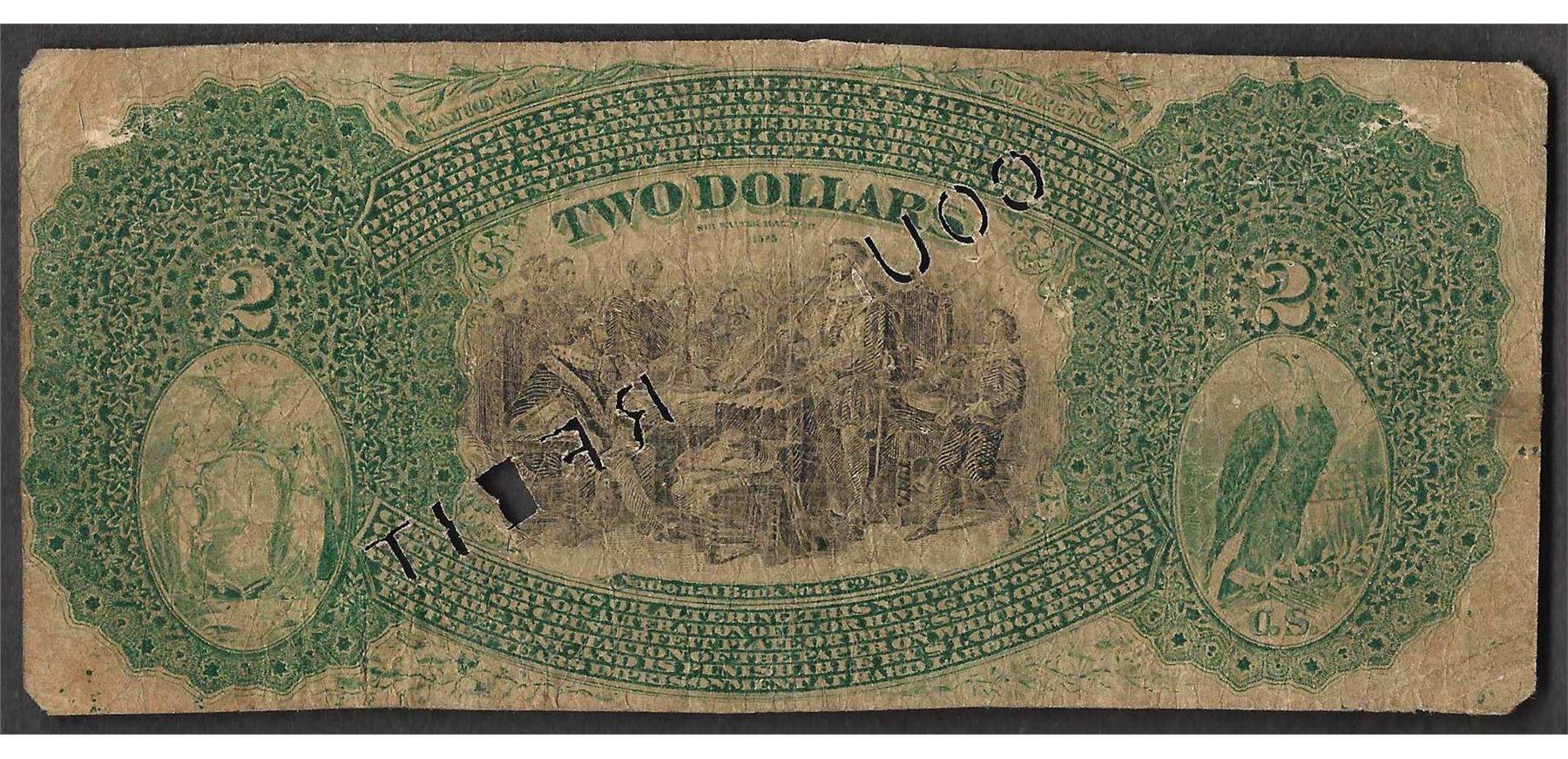 One Contemporary Counterfeit 1865 $2 Lazy Deuce West Chester National Bank Note.