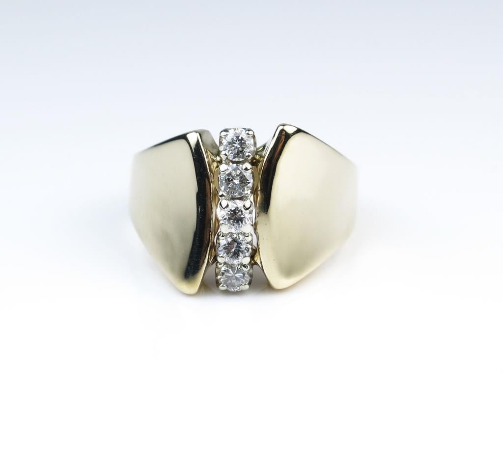 Features 5 round cut diamonds weighing approx. 0.30 carats with H-I colors and SI clarity set in 14 karat yellow gold mounting.