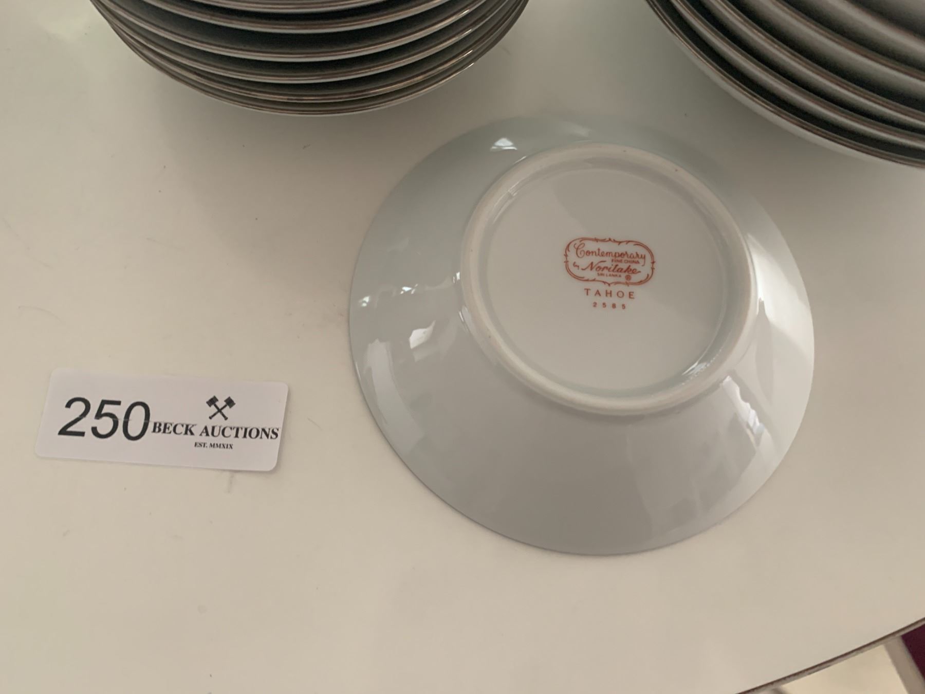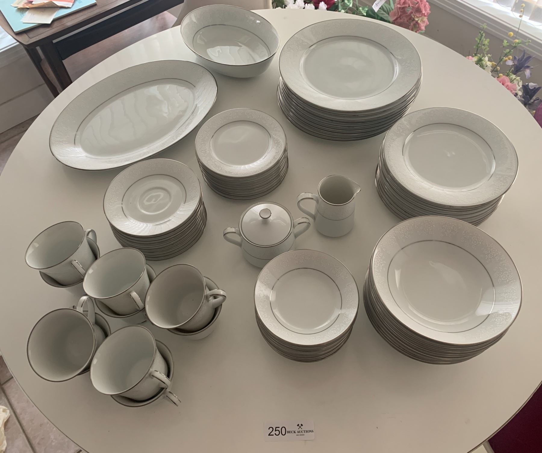 10 x teacups, 10 x saucers, 10 x small plates, 10 x small bowls, 10 x salad bowls, 10 x dessert plates, 10 x dinner plates, 1 x creamer, 1 x sugar bowl, 1 serving plate, 1 x serving bowl