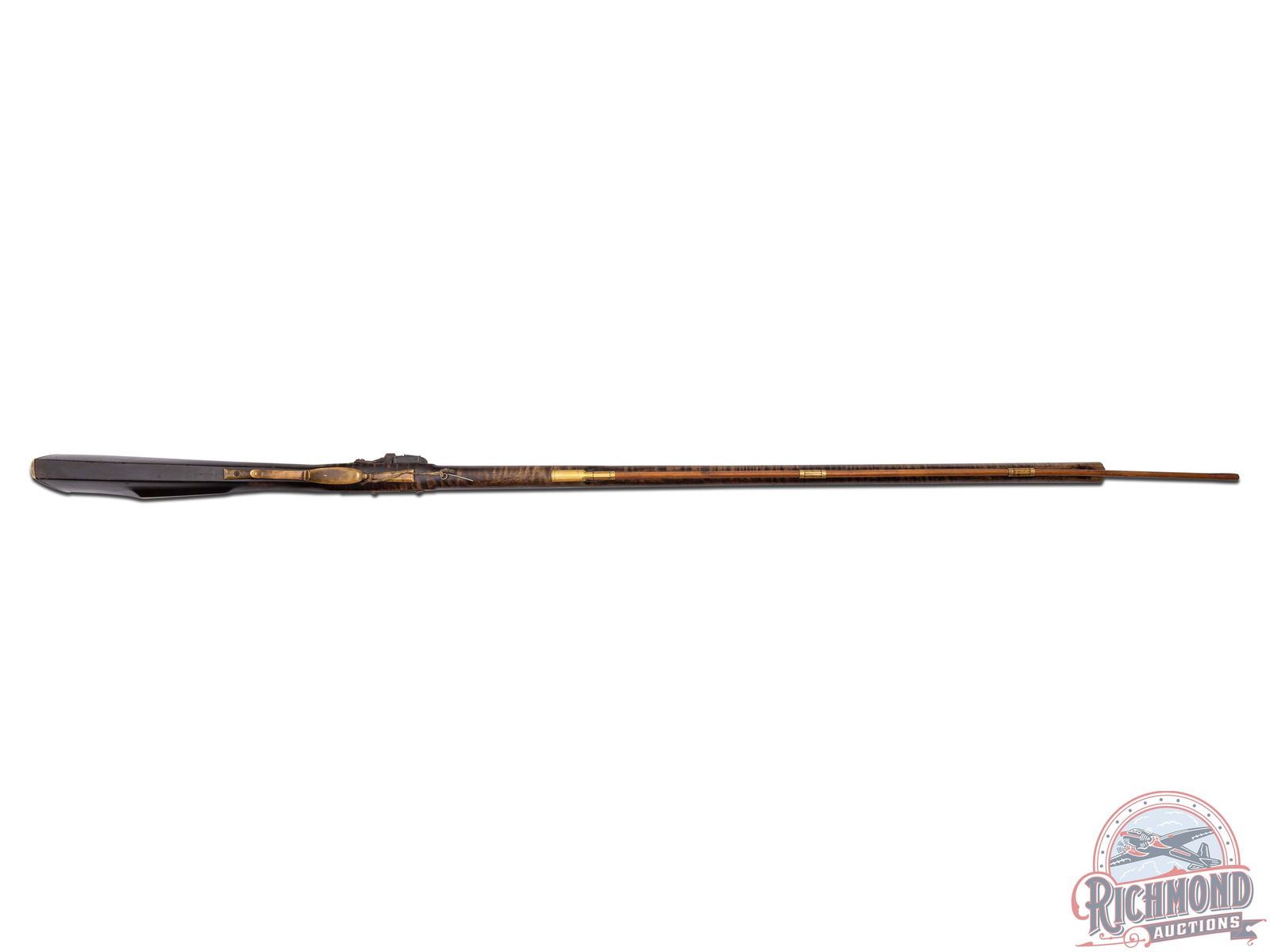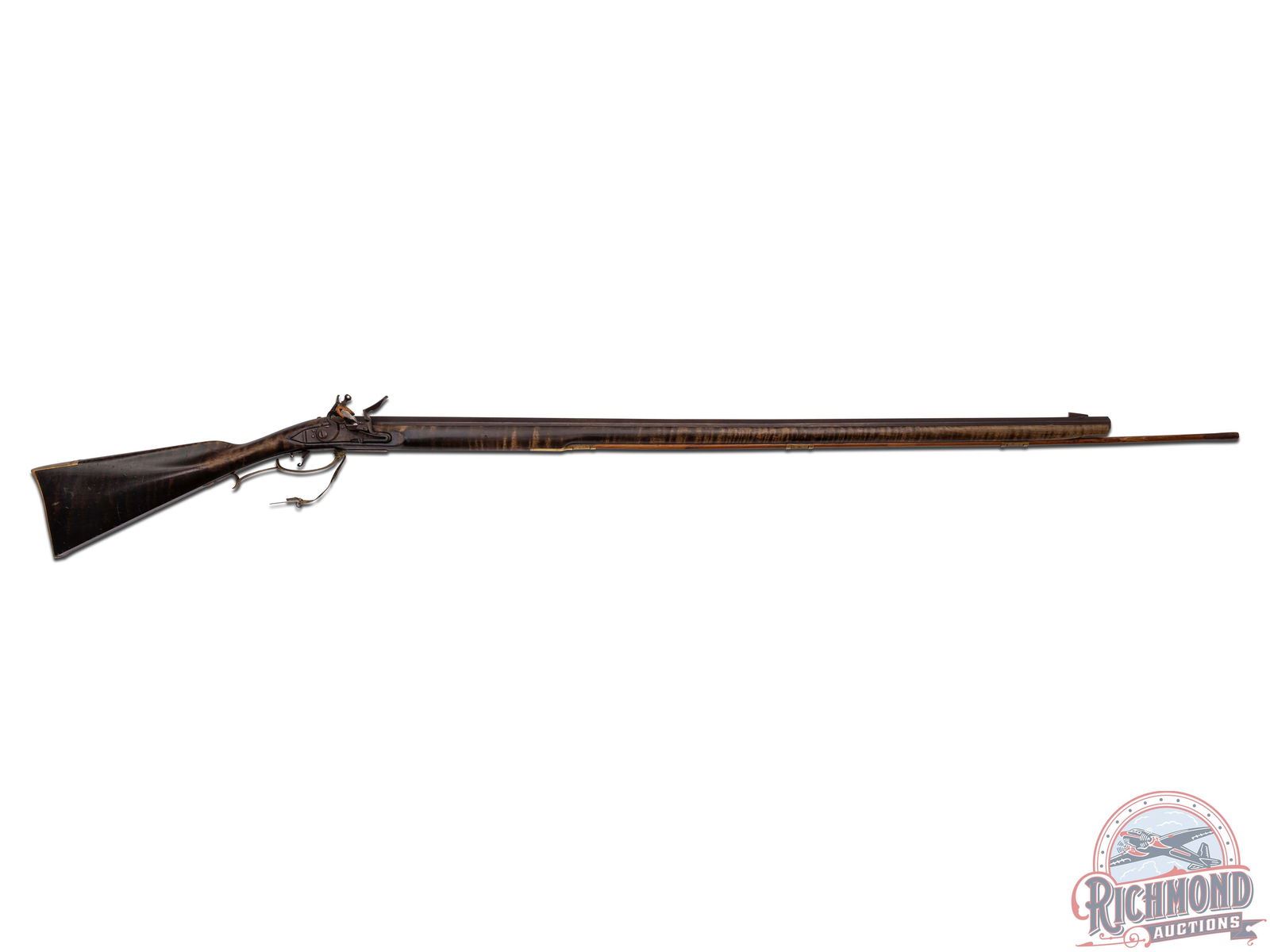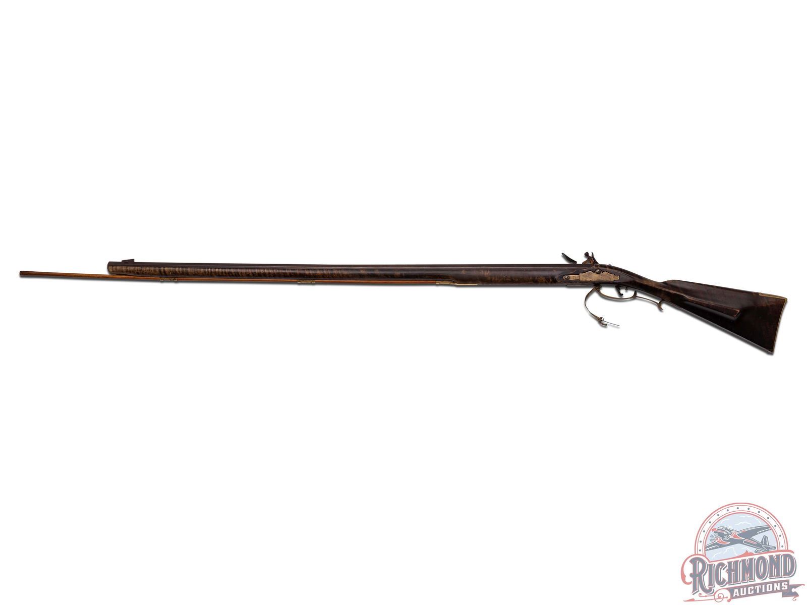 Contemporary flintlock rifle built in J.P. Beck style by an unknown gunsmith, circa 1980. Rifle measures 58" overall with a 41-3/4" octagon 69 caliber smoothbore barrel with single blade front sight. Siler style flintlock with single turned tail trigger. Full curly maple stock with 2" wide butt stock done in Beck style architecture with brass hardware. Rifle comes with touch hole pic and hardwood ramrod. CALIBER: 69. FFL STATUS: Antique.