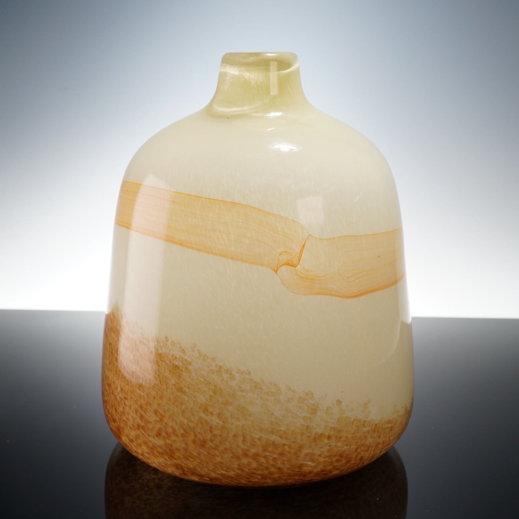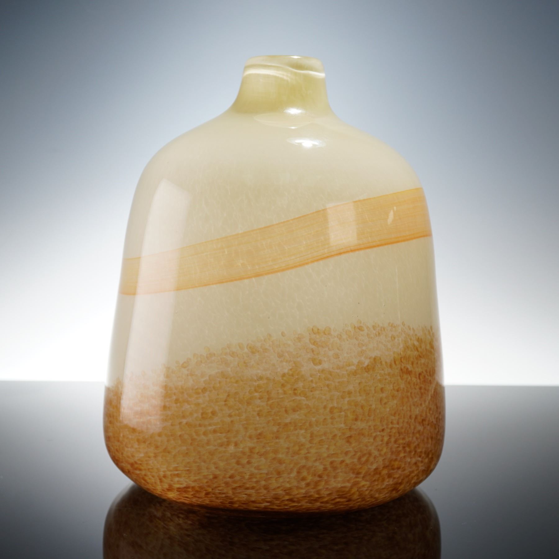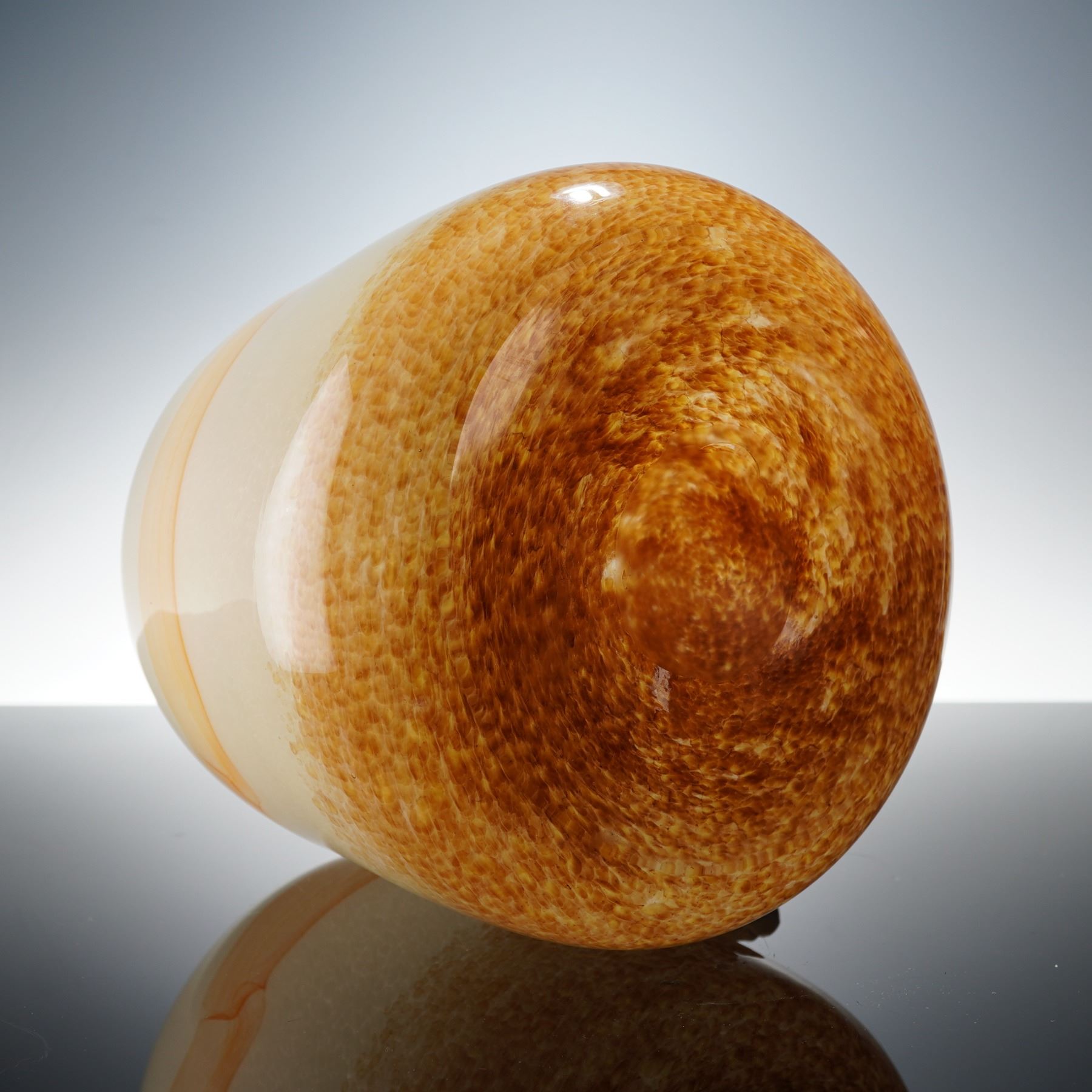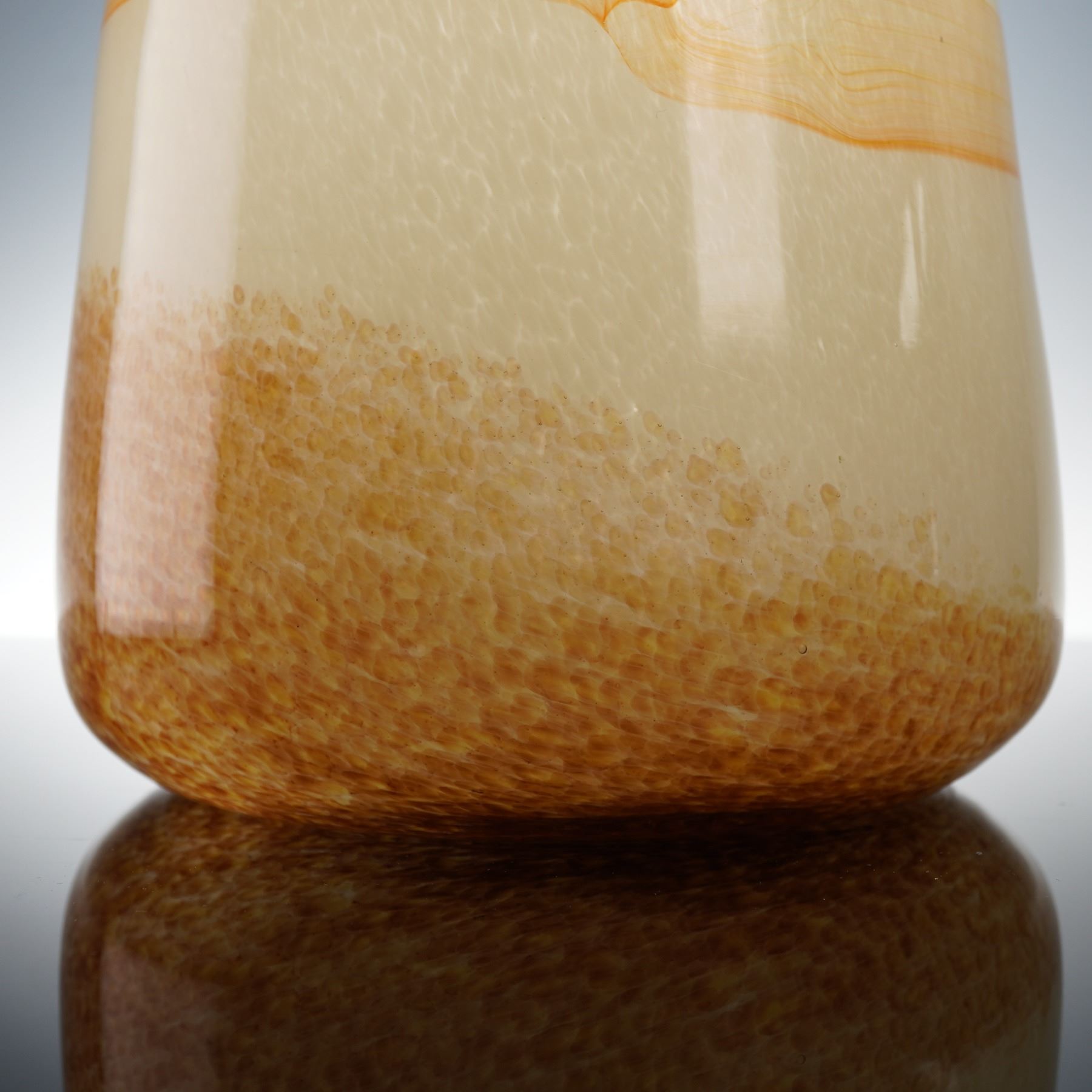 A modern handblown art glass vase featuring a softly tapered cylindrical form with an asymmetrical neck. The body showcases a rich gradient from warm amber mottling at the base to creamy ivory tones above, accented by a subtle horizontal band of translucent gold. The smooth surface and organic color transitions highlight the artistry of contemporary glasswork.