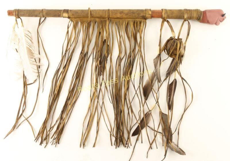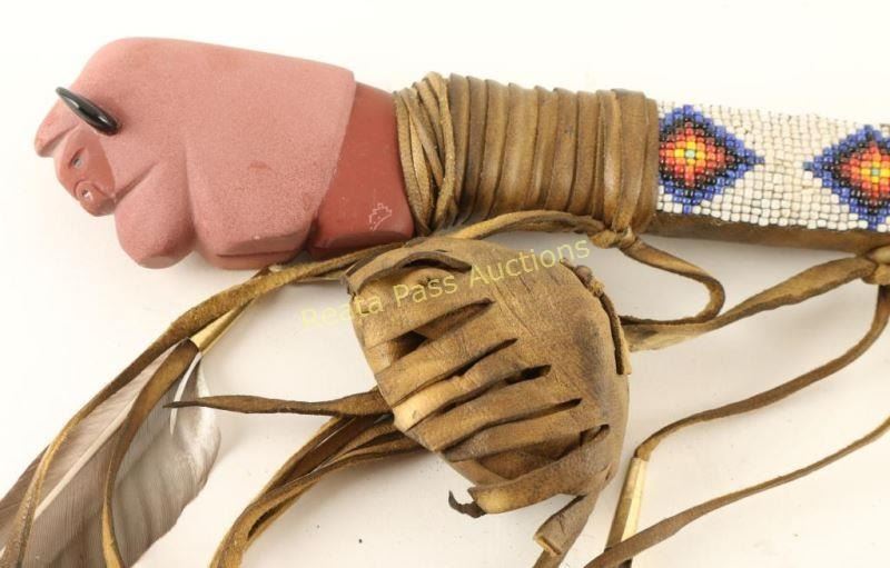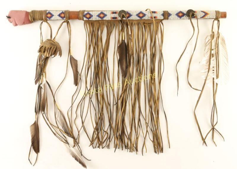 Geometric beaded design, leather fringe, feathers and a buffalo stone carved bowl. Measures 27" long. Great decorator.